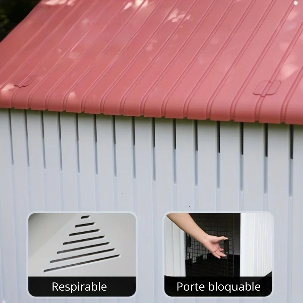 Ses parois épaisses, son toit rigide et sa porte grillagée offrent stabilité et sécurité.