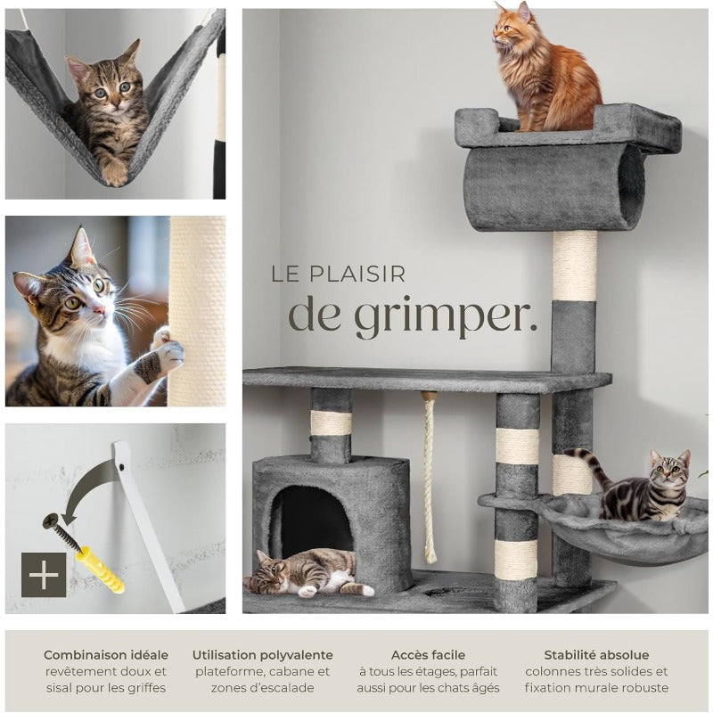 Offrez à votre chat un arbre à chat complet avec hamac, tunnel, cabane et griffoirs en sisal, pour un espace de jeu, de repos et de griffage optimal à la maison.