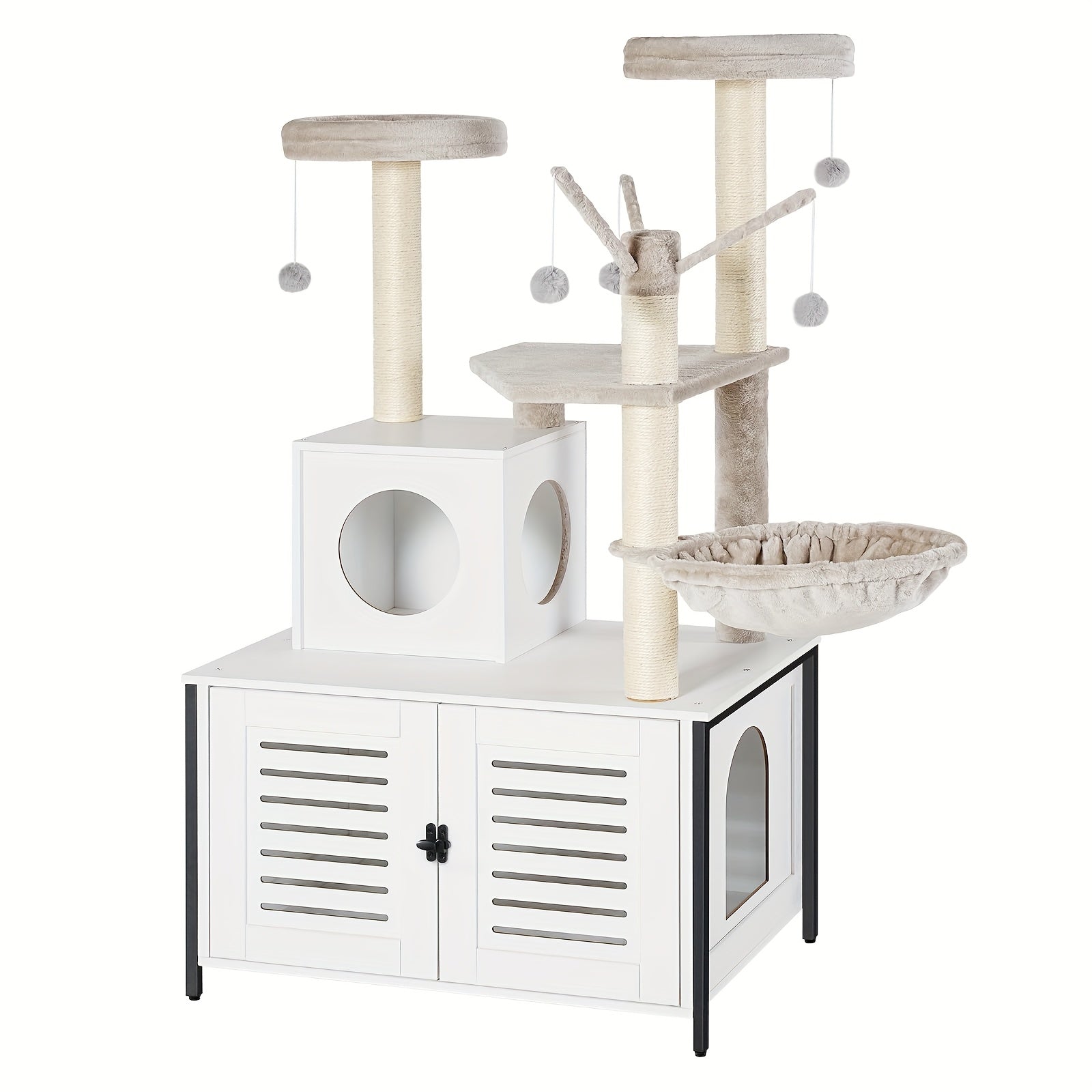 Cet arbre à chat combine espace de jeu, de repos et meuble à litière discret.