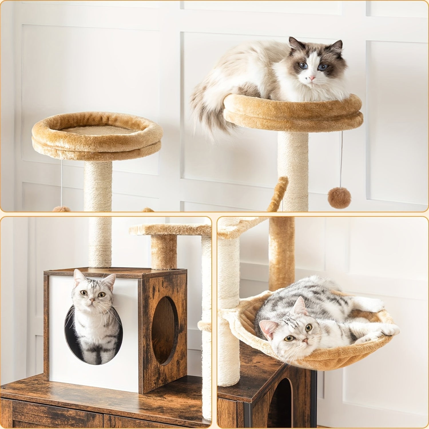 Offrez à votre félin un arbre à chat tout-en-un avec meuble intégré pour litière, perchoirs, hamac et jouets en peluche. Un mobilier élégant et fonctionnel pour votre intérieur.