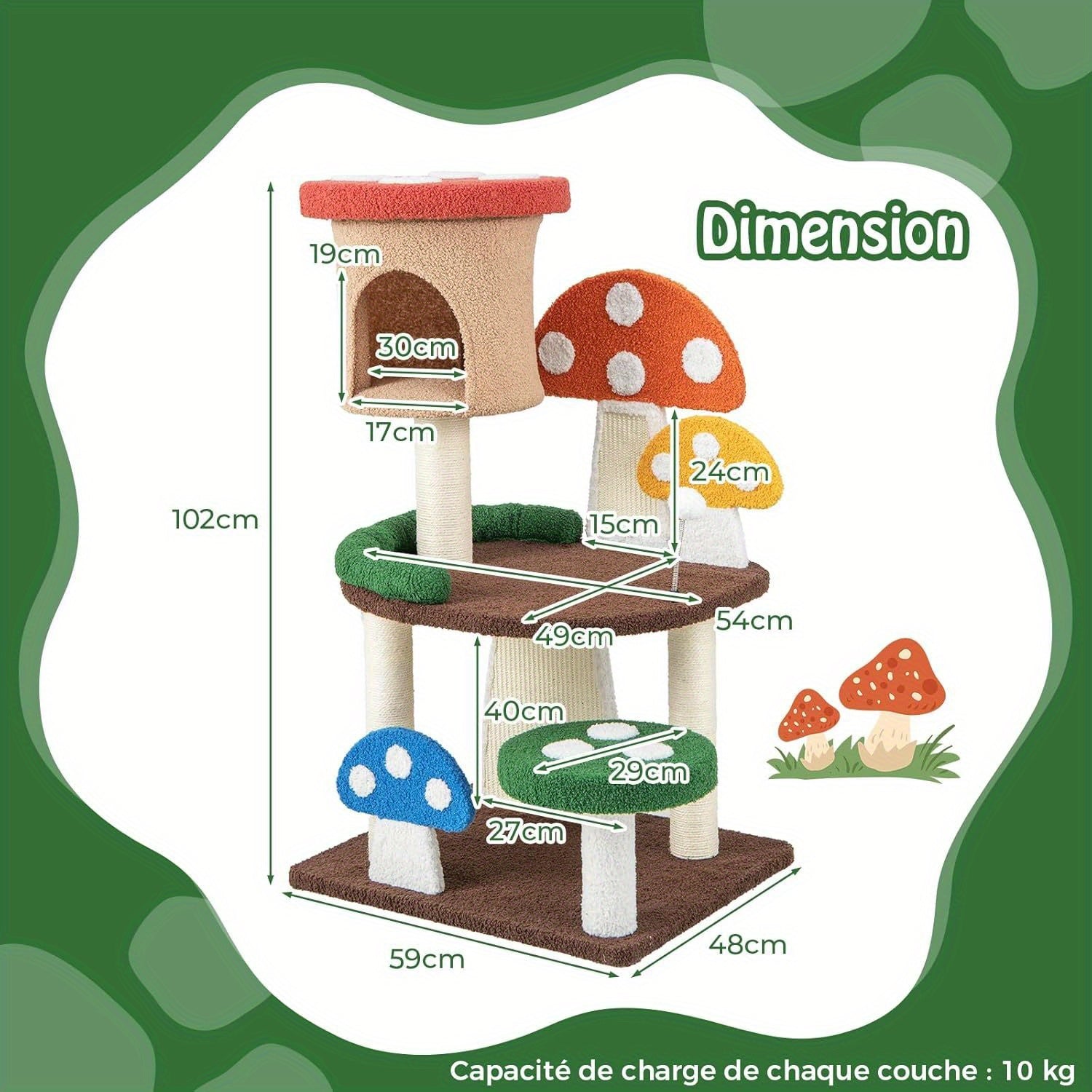 Cet arbre à chat en forme de champignon propose plusieurs niveaux, offrant à votre félin des plateformes variées pour grimper et se reposer.
