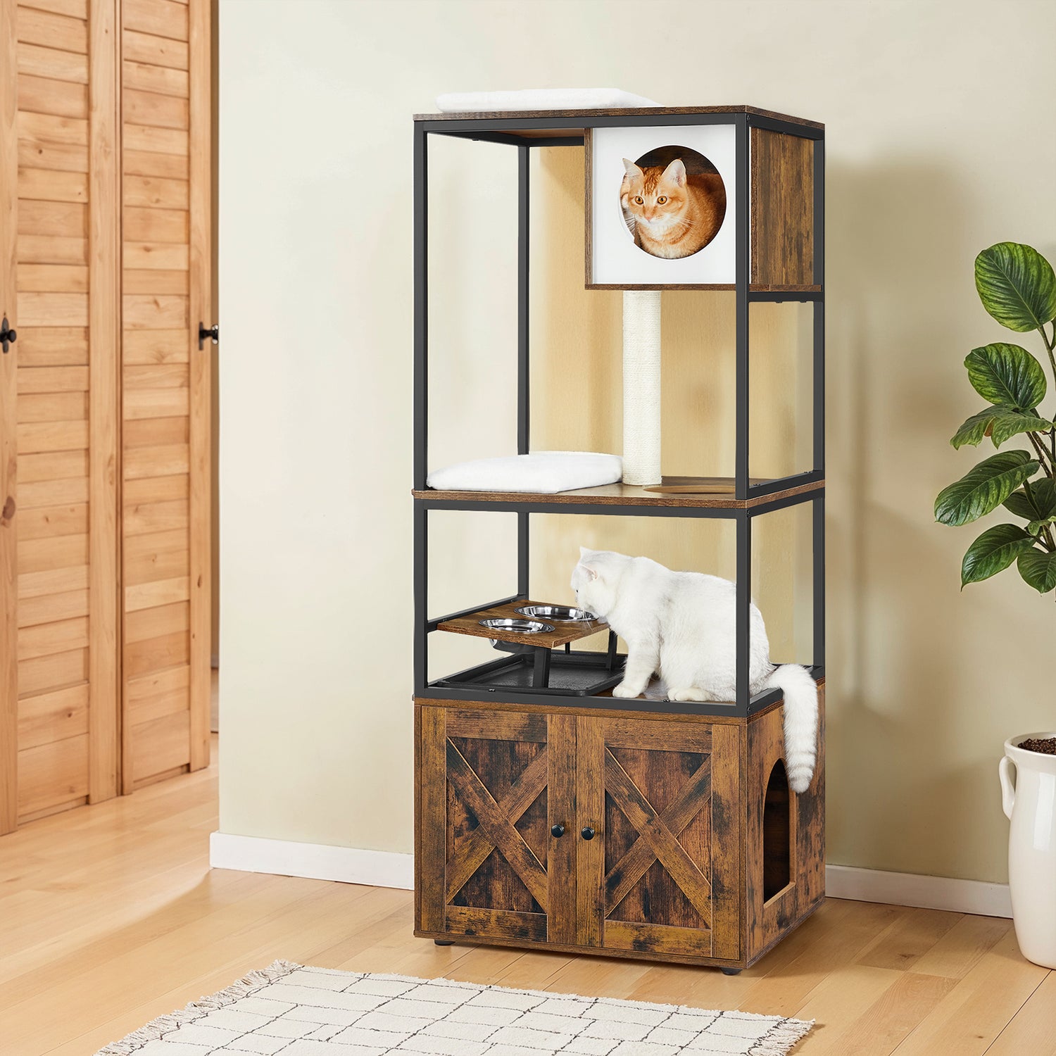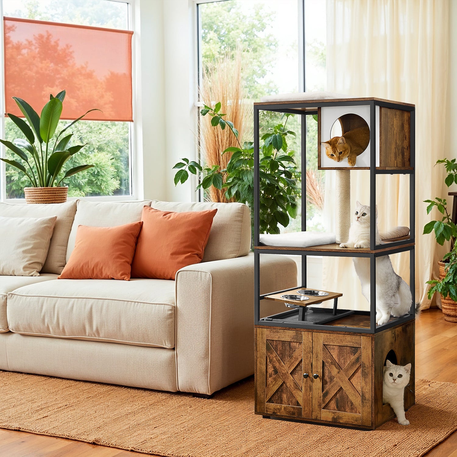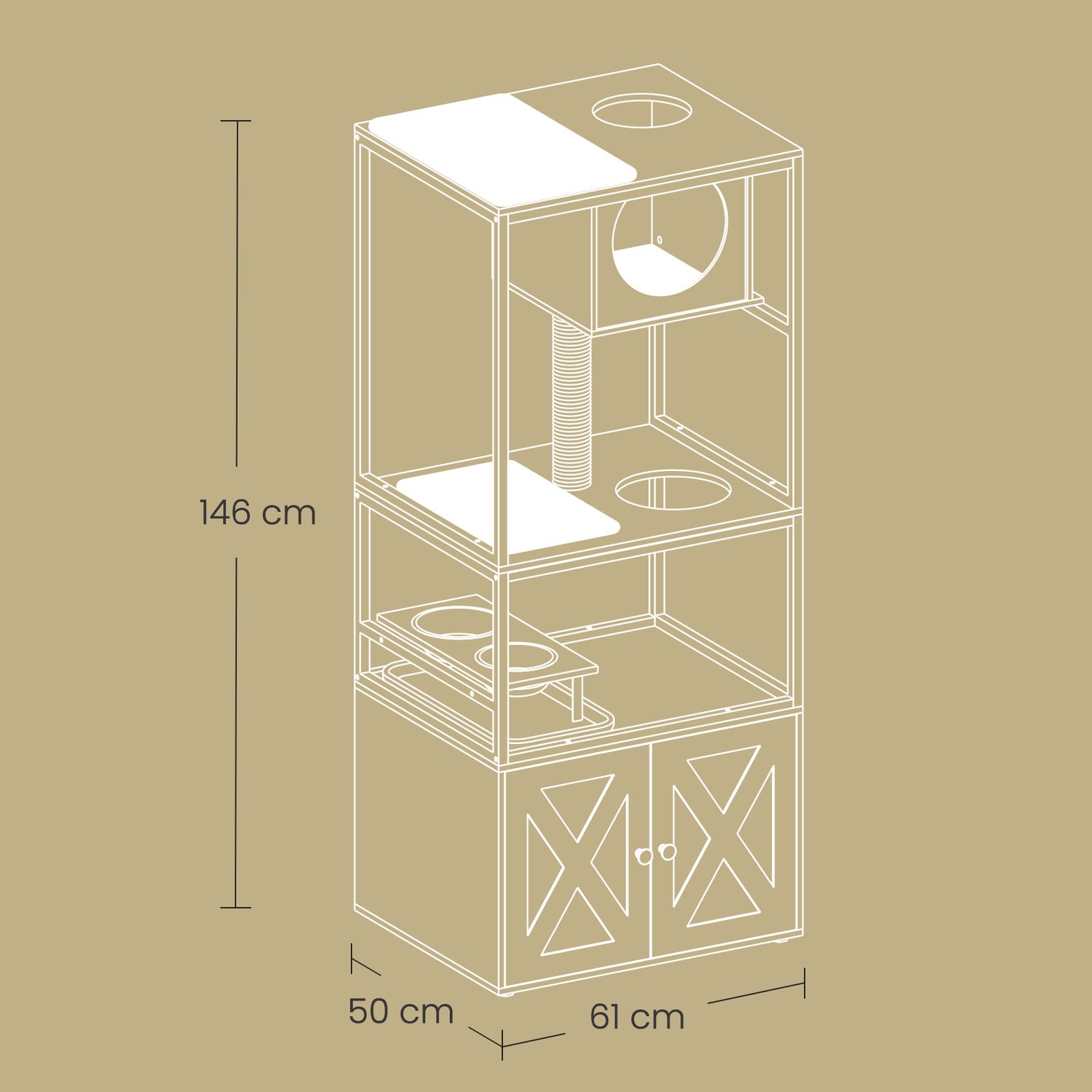 Offrez à votre chat un arbre à chat élégant et solide avec maison fermée, griffoir en sisal et gamelles élevées pour un espace complet de repos, jeu et repas en toute sécurité.