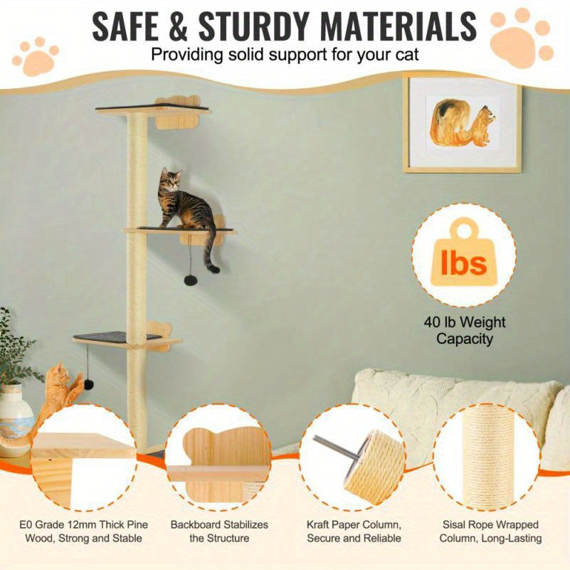 Offrez à votre chat un arbre mural multi-niveaux en bois de pin, avec plateformes antidérapantes et poteaux à griffer, parfait pour grimper, jouer et se détendre tout en économisant de l’espace.