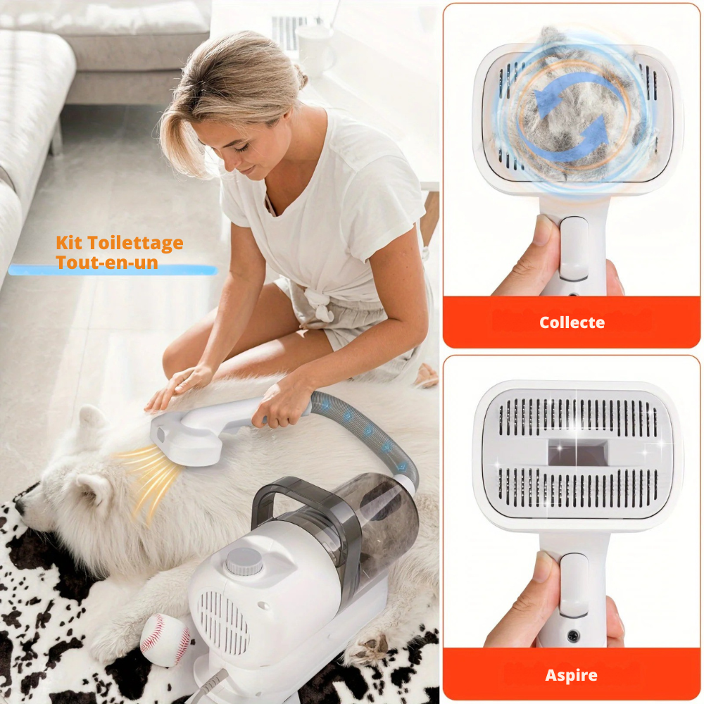 Aspirateur silencieux 2.5L pour chiens et chats, avec brosses, tondeuse et peigne inclus. Parfait pour enlever les poils et entretenir facilement la fourrure à la maison.