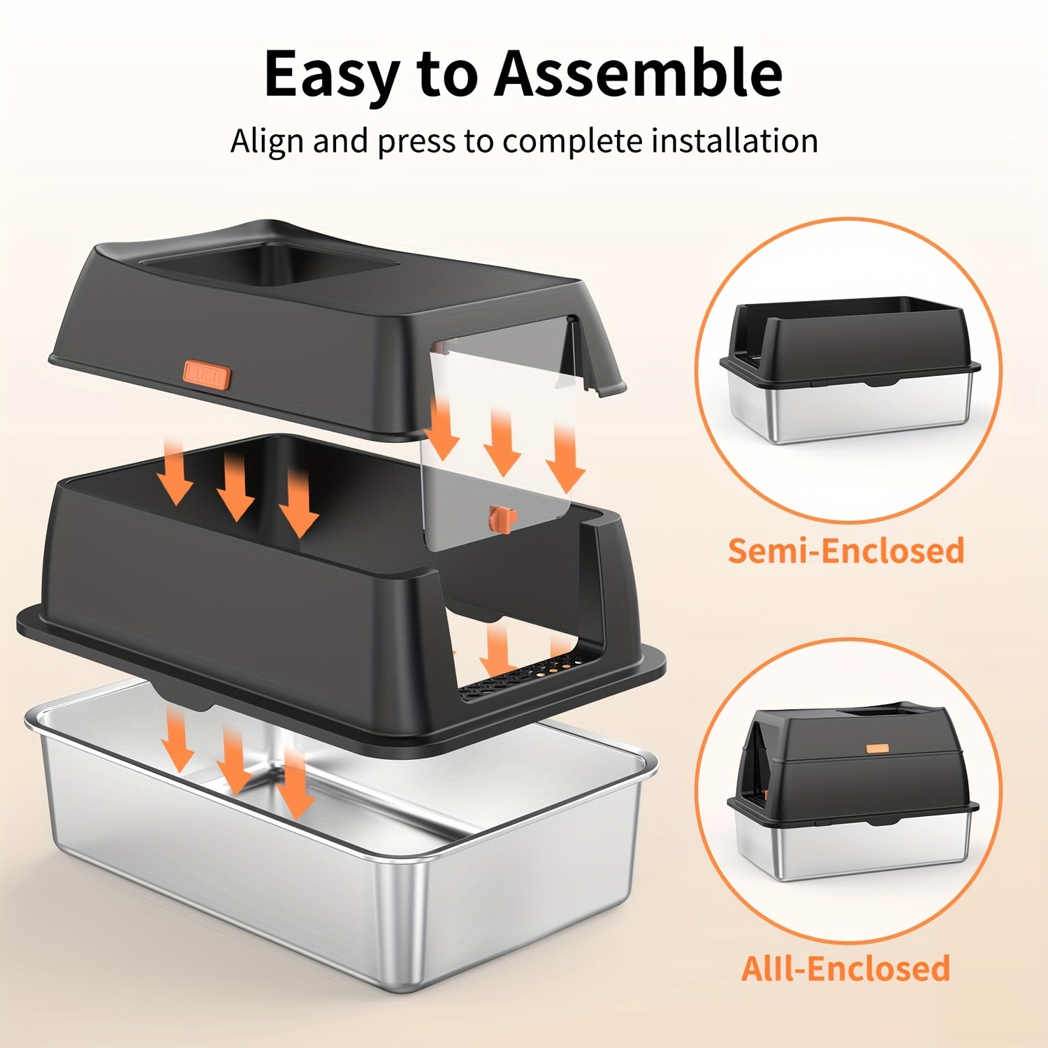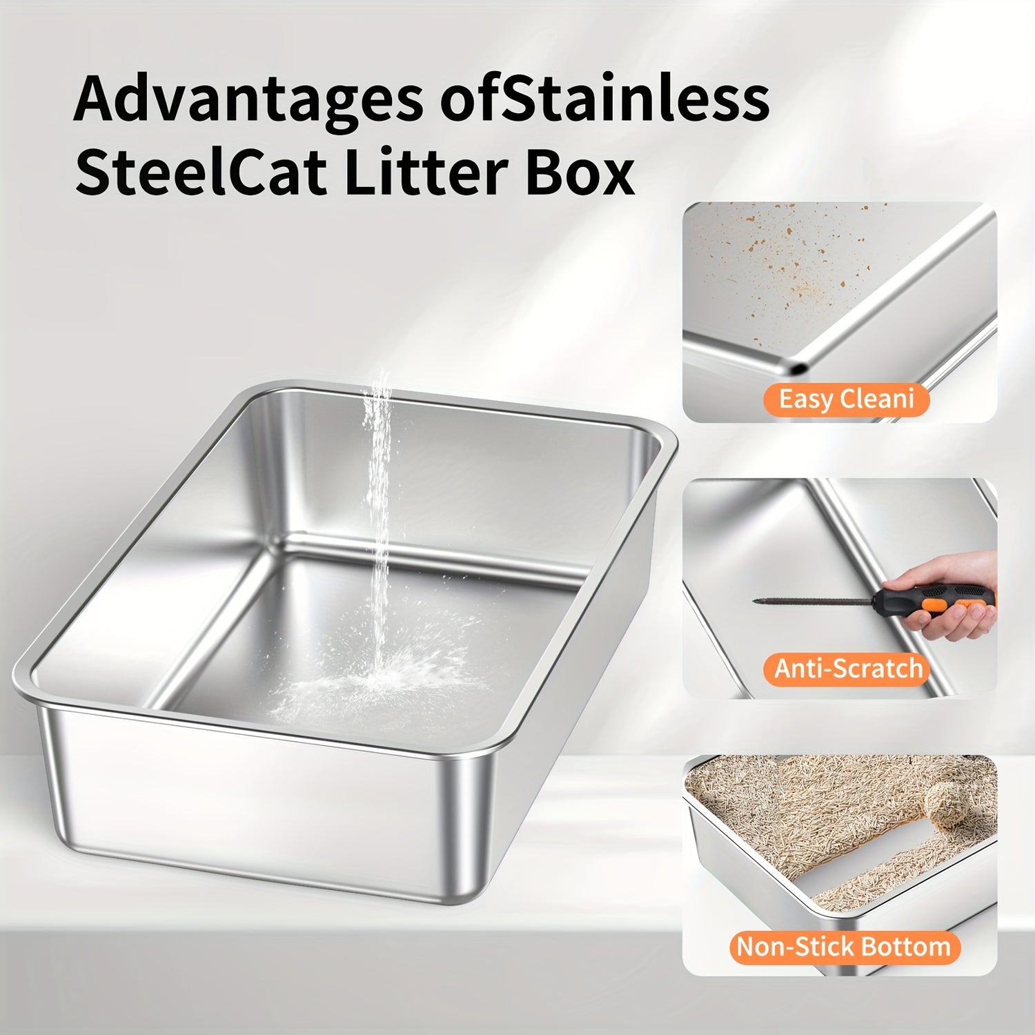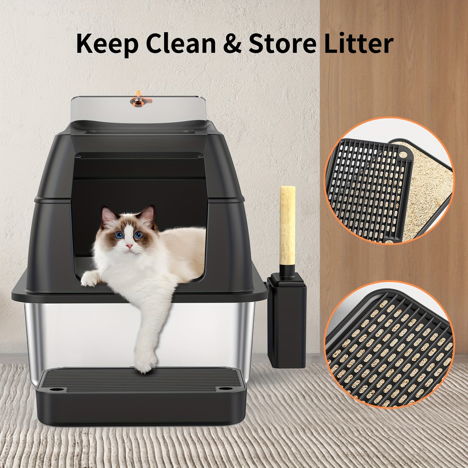 Optez pour un bac à litière en acier inoxydable XXL, avec couvercle et accès par l’avant ou par le haut, conçu pour grands chats et foyers multi-félins.