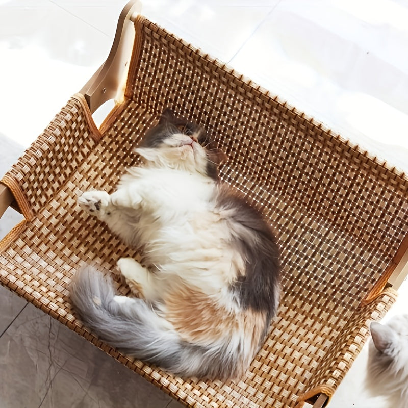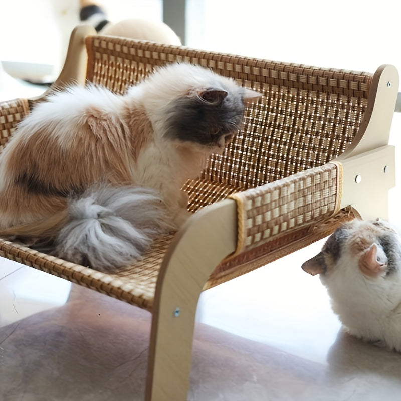 Sa structure rigide en bois et rotin tressé s’adapte à la morphologie du chat sans s’affaisser.