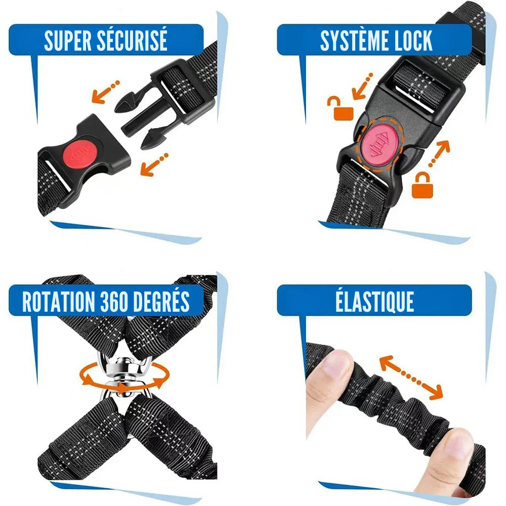 Cette ceinture de sécurité voiture pour chien avec double sangle et appui-tête garde vos compagnons attachés, en sécurité et confortables grâce à ses élastiques amortisseurs.