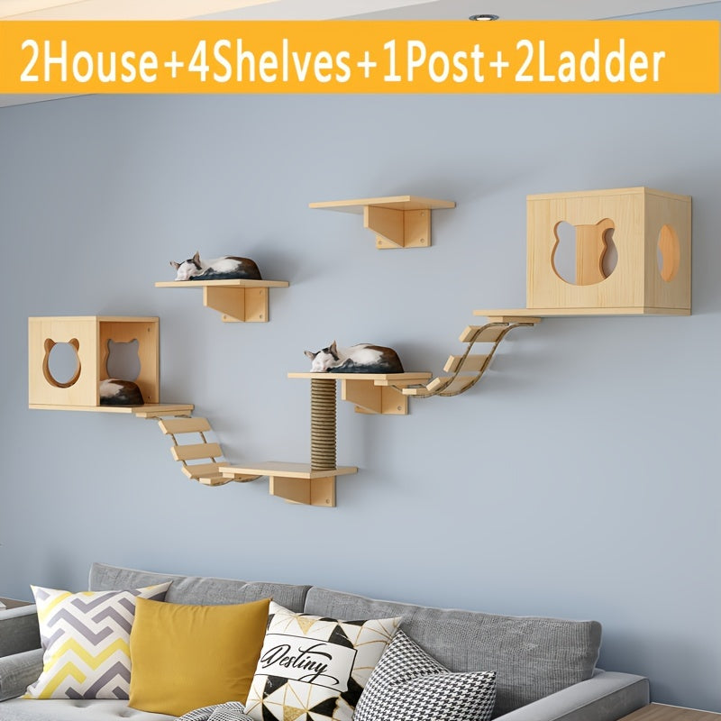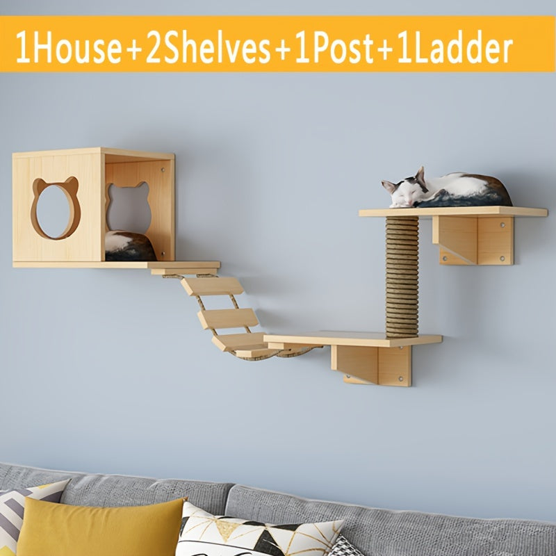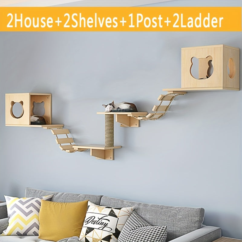 Ensemble Mural pour Chat avec Maison, Étagères, Griffoir et Pont en Bois