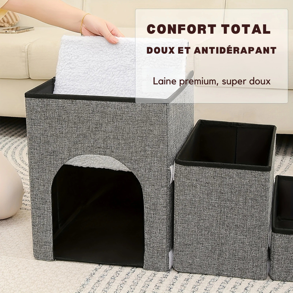 Escalier de Rangement pour Animaux 3 en 1, avec niche, rangement intégré et surface antidérapante. Idéal pour petits chiens et chats, supporte jusqu'à 75 kg. Pliable et élégant.