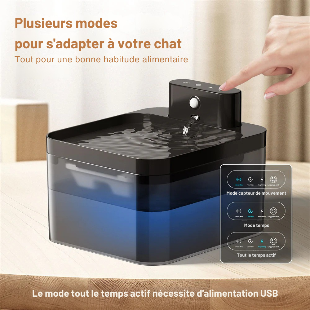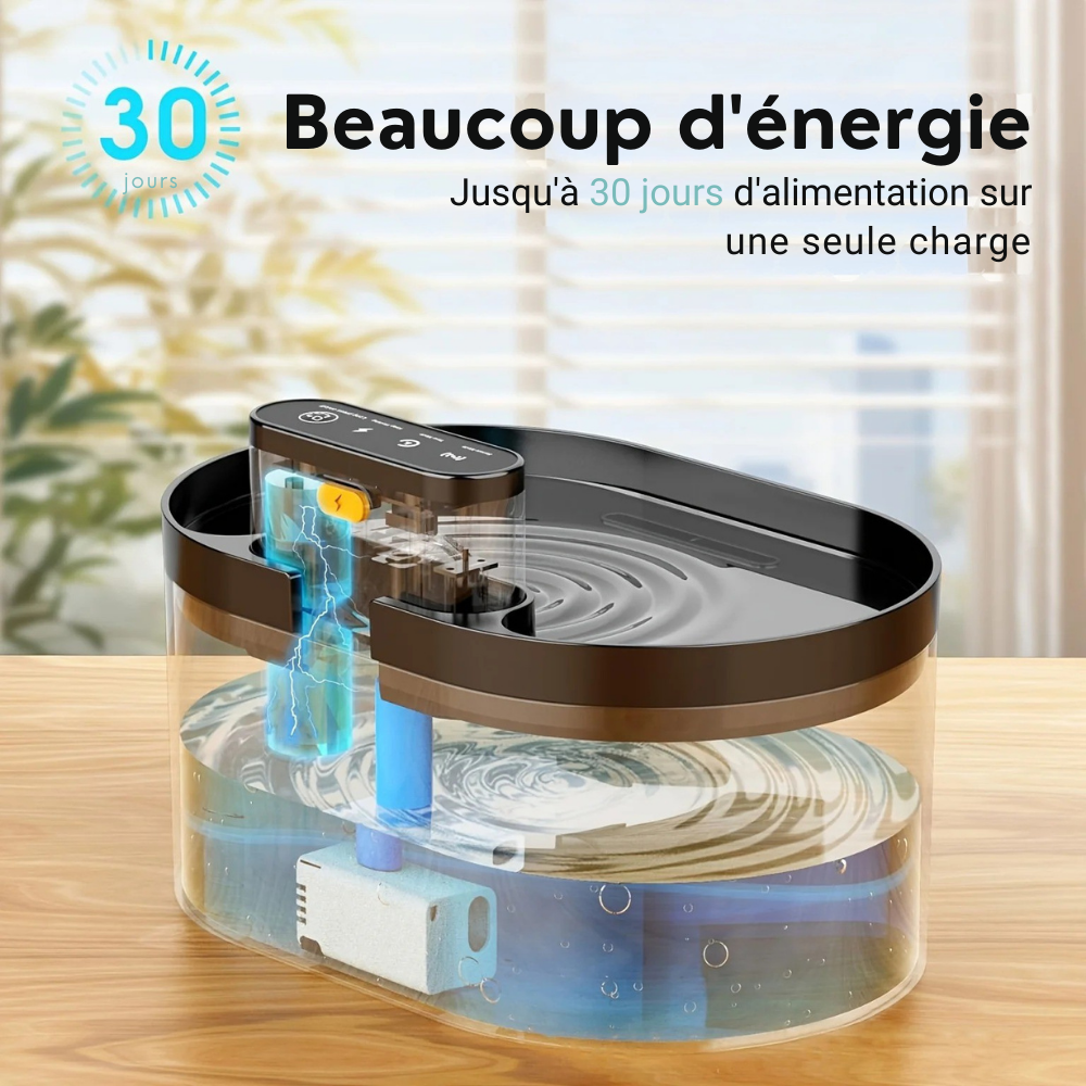 Cette fontaine intelligente 2.2L fonctionne à la détection de mouvement ou en mode continu. Rechargeable et sans fil, elle garantit une eau fraîche et silencieuse !