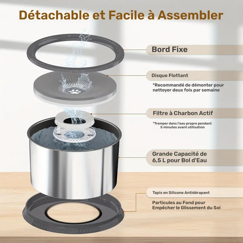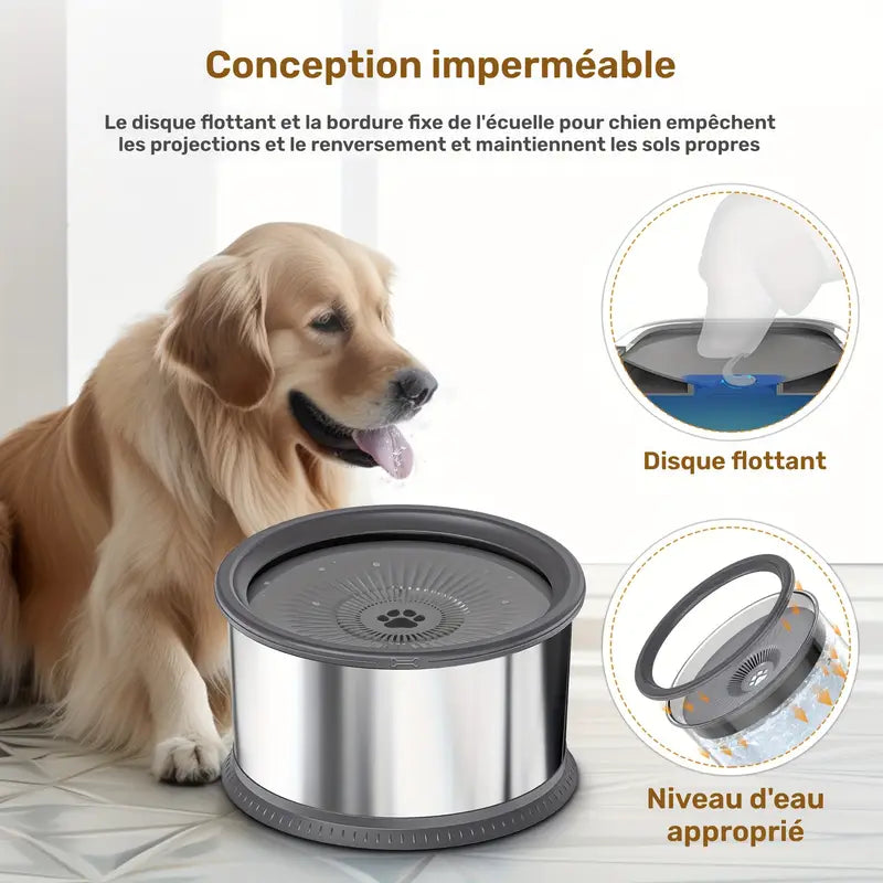 Le disque flottant au centre limite l’accès à l’eau, ralentit l’ingestion et empêche les éclaboussures.