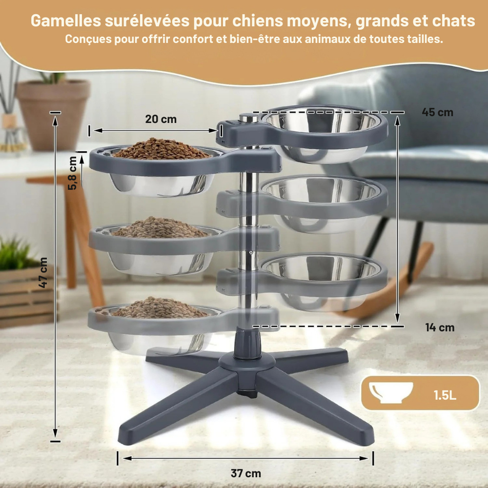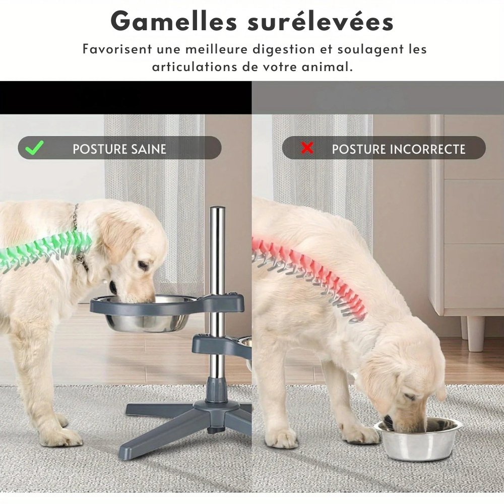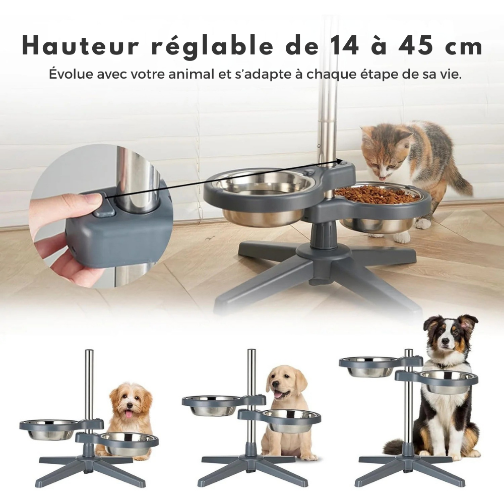 Cette station de repas ajustable avec gamelles inox soulage les articulations et favorise la digestion de votre chien ou chat, quelle que soit sa taille !