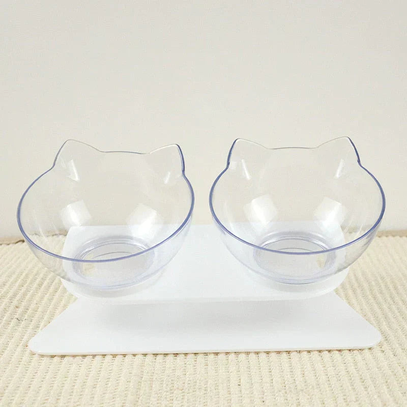 - Forme : Double bols inclinés en forme de tête de chat sur support surélevé