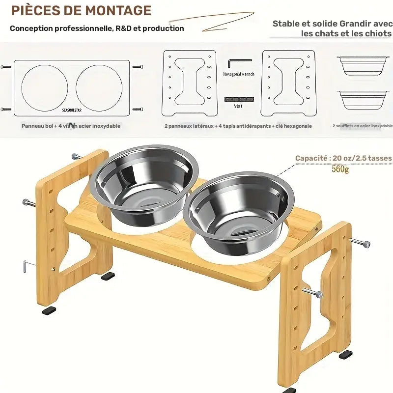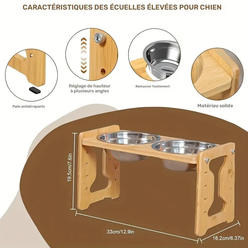 Gamelle surélevée réglable en bambou pour chien & chat