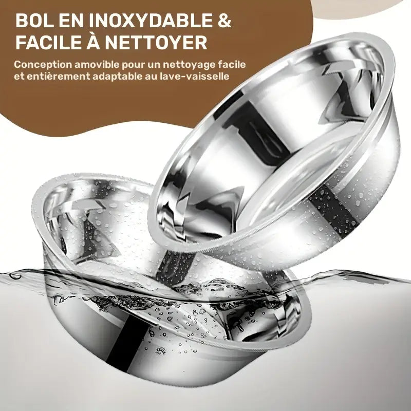 - Entretien : Bols inox amovibles – lavage facile