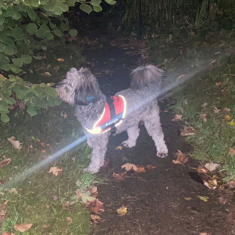 - Particularité : Sangle réfléchissante, poignée dorsale intégrée (hors taille XS), plaque personnalisable (nom + téléphone), boucle anti-traction