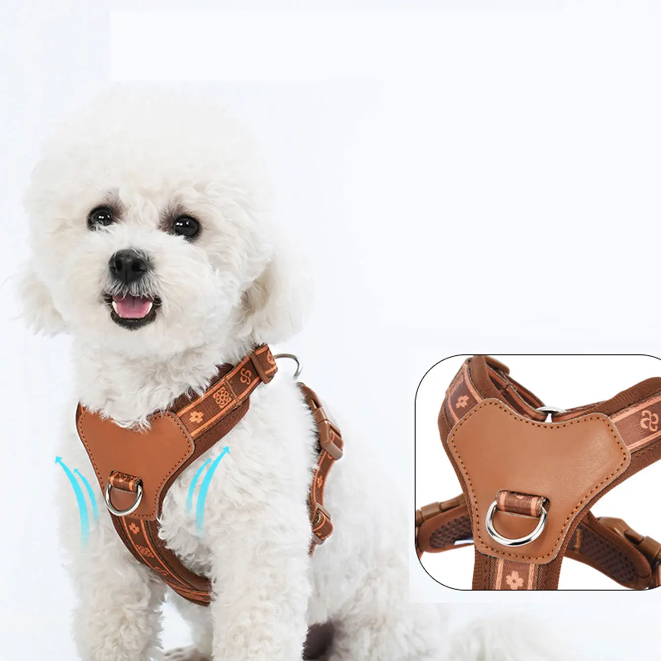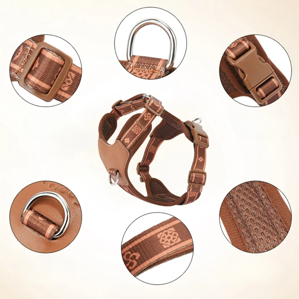 Ce harnais pour chien haut de gamme en cuir synthétique et mesh respirant allie élégance et sécurité. Parfait pour chiens puissants ou actifs, tout en confort.