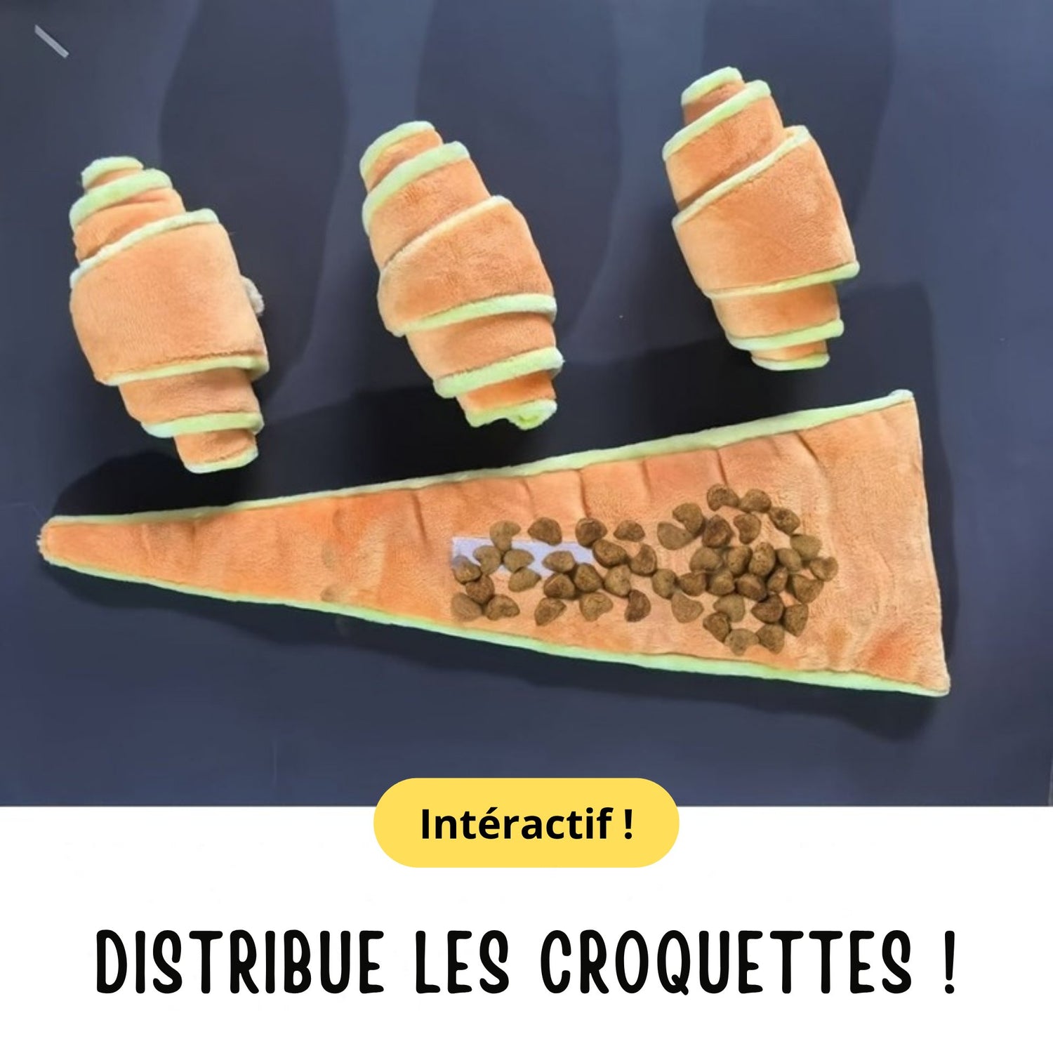 Jouet croissant interactif en peluche douce, parfait pour dissimuler des friandises. Avec papier sonore, il stimule, amuse et apaise les petits à moyens chiens.