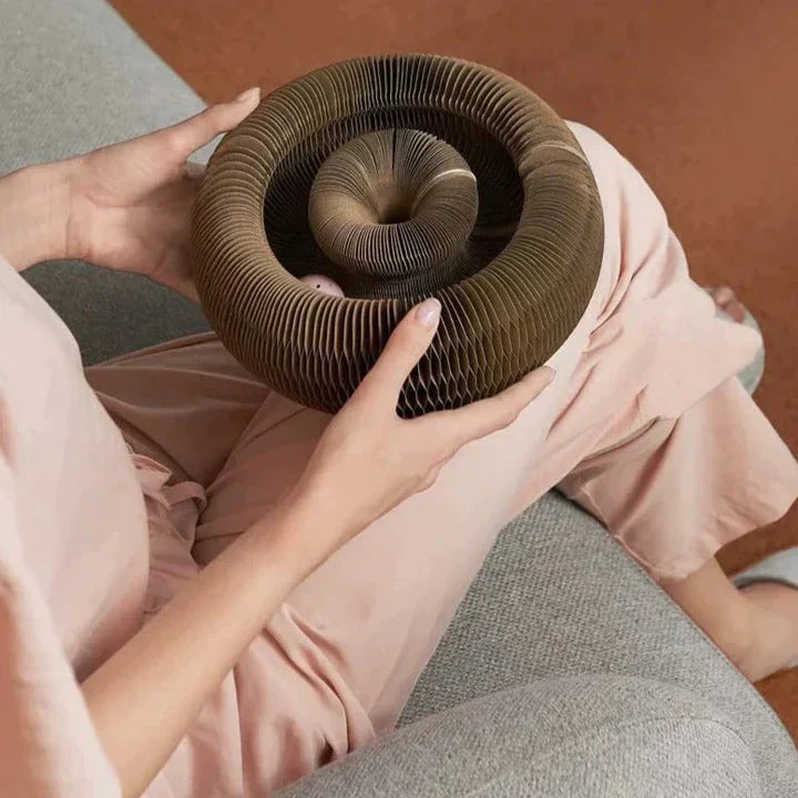 Amusez votre félin avec un jouet piste-balle pliable en carton ondulé, qui combine griffoir, exercice et divertissement durable.