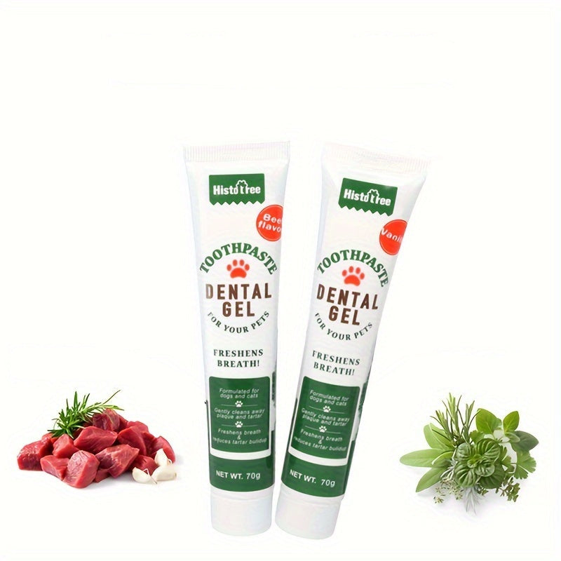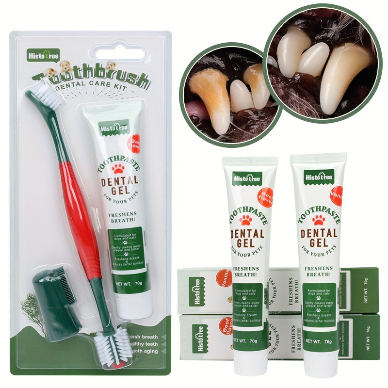 Kit dentaire pour chien avec dentifrice saveur bœuf ou vanille, réduit la plaque, rafraîchit l'haleine et blanchit les dents. Inclus brosse classique et brosse doigt.