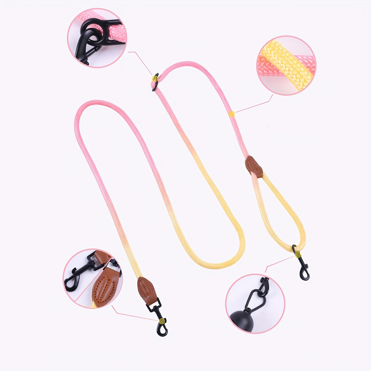 Cette laisse tissée offre un dégradé pastel doux, complété par des détails en cuir synthétique cousu.