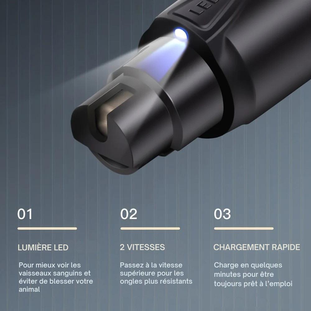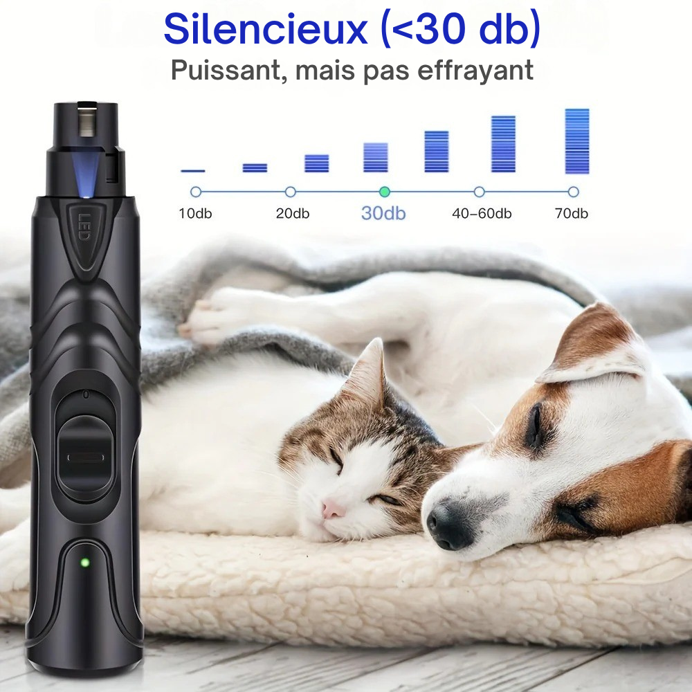 Le Limeur Électrique Silencieux pour Griffes avec LED fonctionne à moins de 30 dB, parfait pour les animaux anxieux.