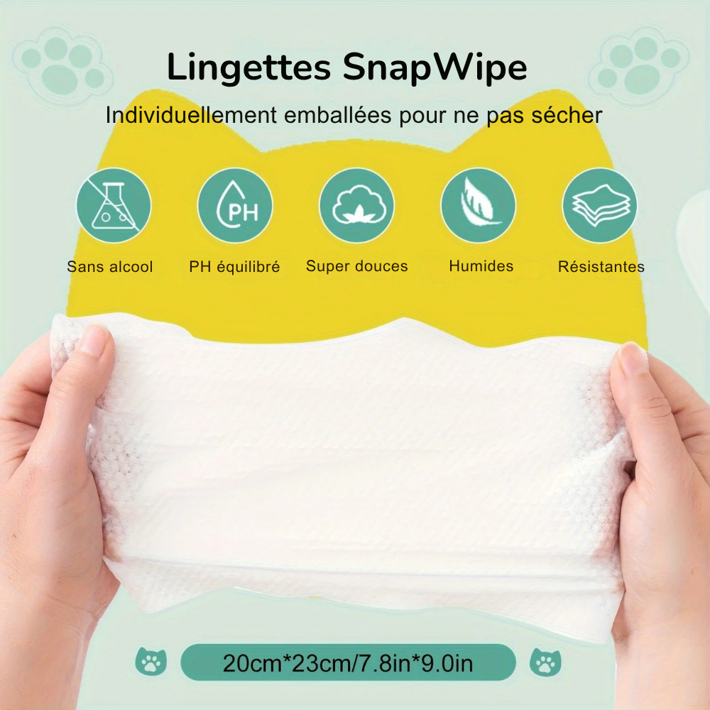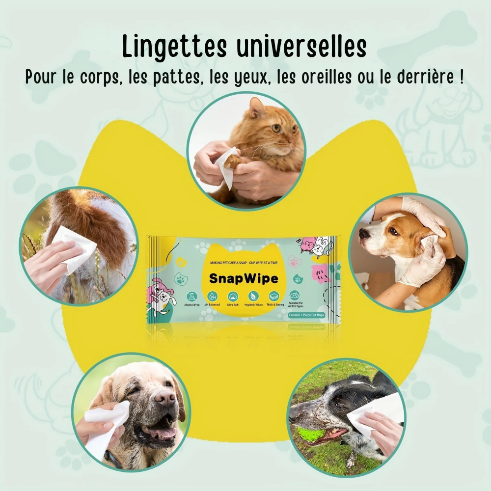 Les lingettes SnapWipe nettoient en douceur les poils et pattes de tous les animaux. Individuellement emballées, elles sont ultra douces, sans alcool, et faciles à emporter.