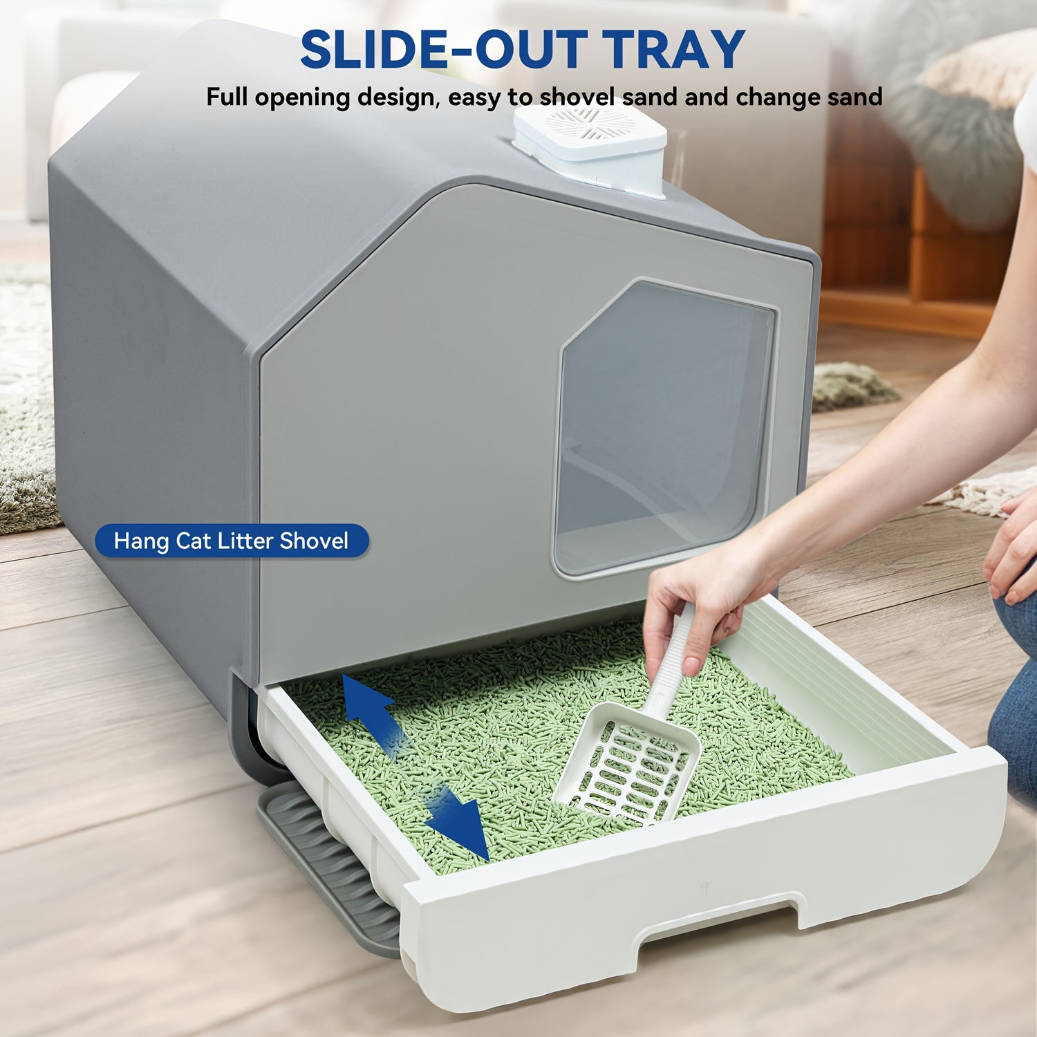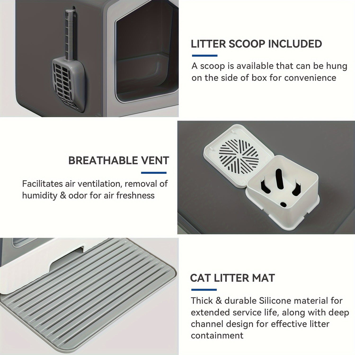 Offrez à votre chat une maison de toilette fermée en silicone et PP avec tapis, pelle et ventilation, conçue pour limiter les odeurs et faciliter le nettoyage.