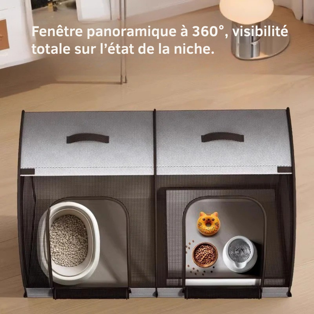Une maison double avec bac à litière intégré, parfaite pour les chats ou petits chiens. En tissu Oxford pliable, elle offre une vue panoramique et un espace confortable.