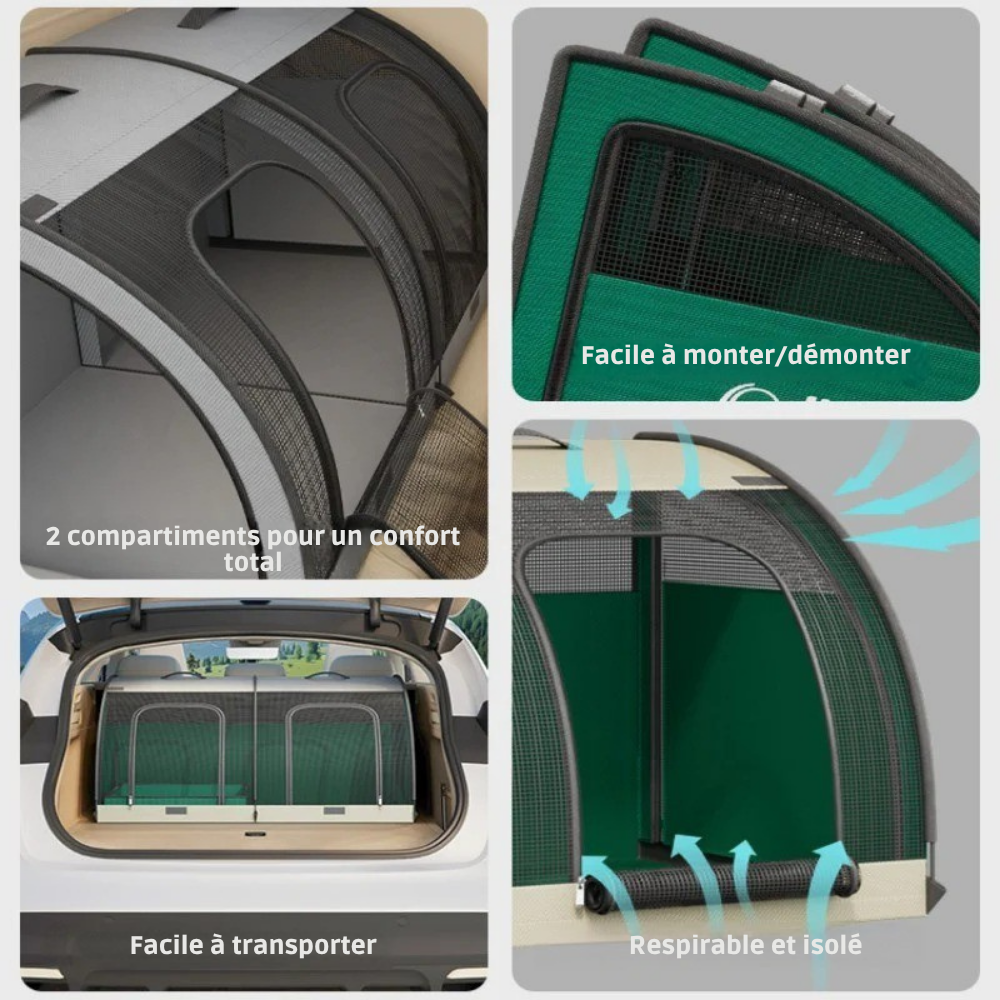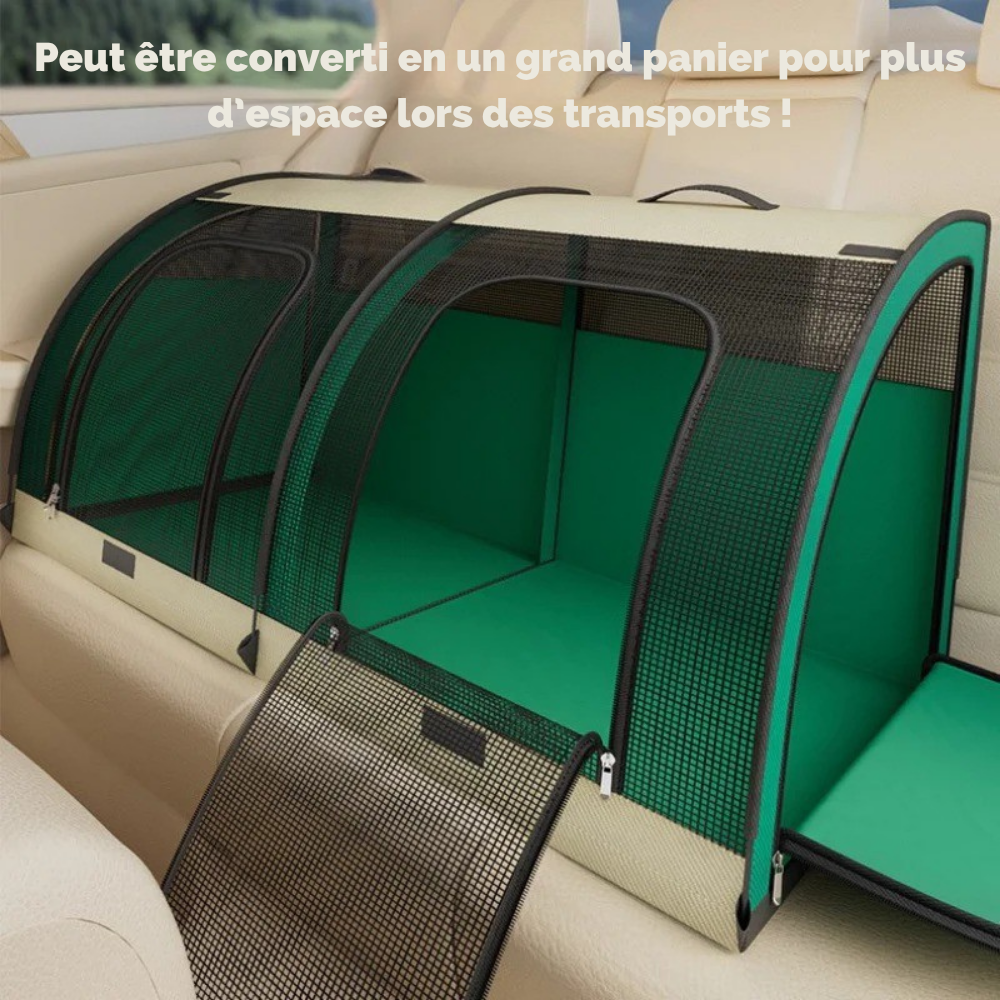 Se plie en quelques secondes sans outil. Parfaite pour les longs trajets, l’usage intérieur, ou comme salle de mise bas.