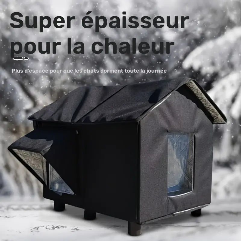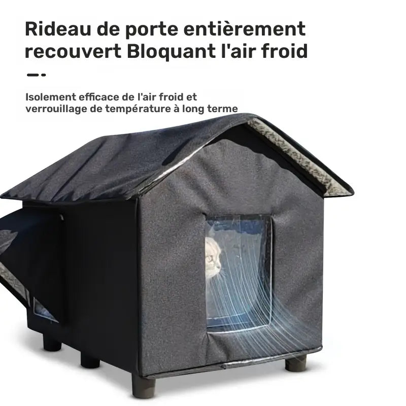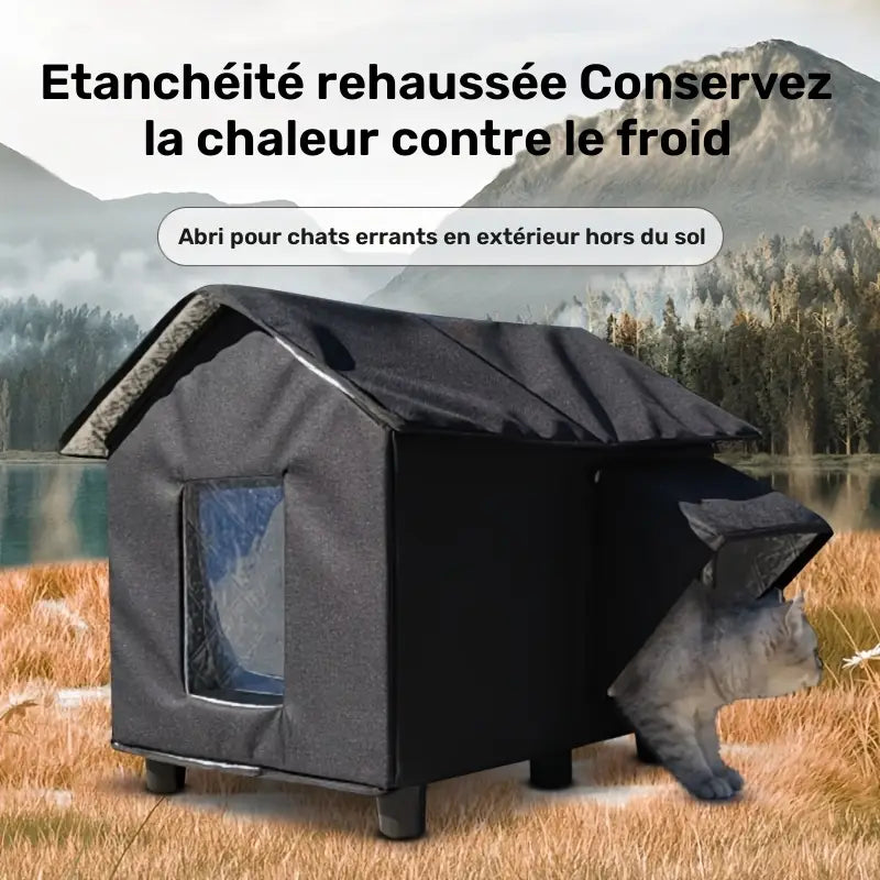 Maison imperméable pour chat ou petit chien en tissu Oxford isolant, idéale en hiver extérieur, avec base surélevée et protection contre la pluie, le froid et le vent.