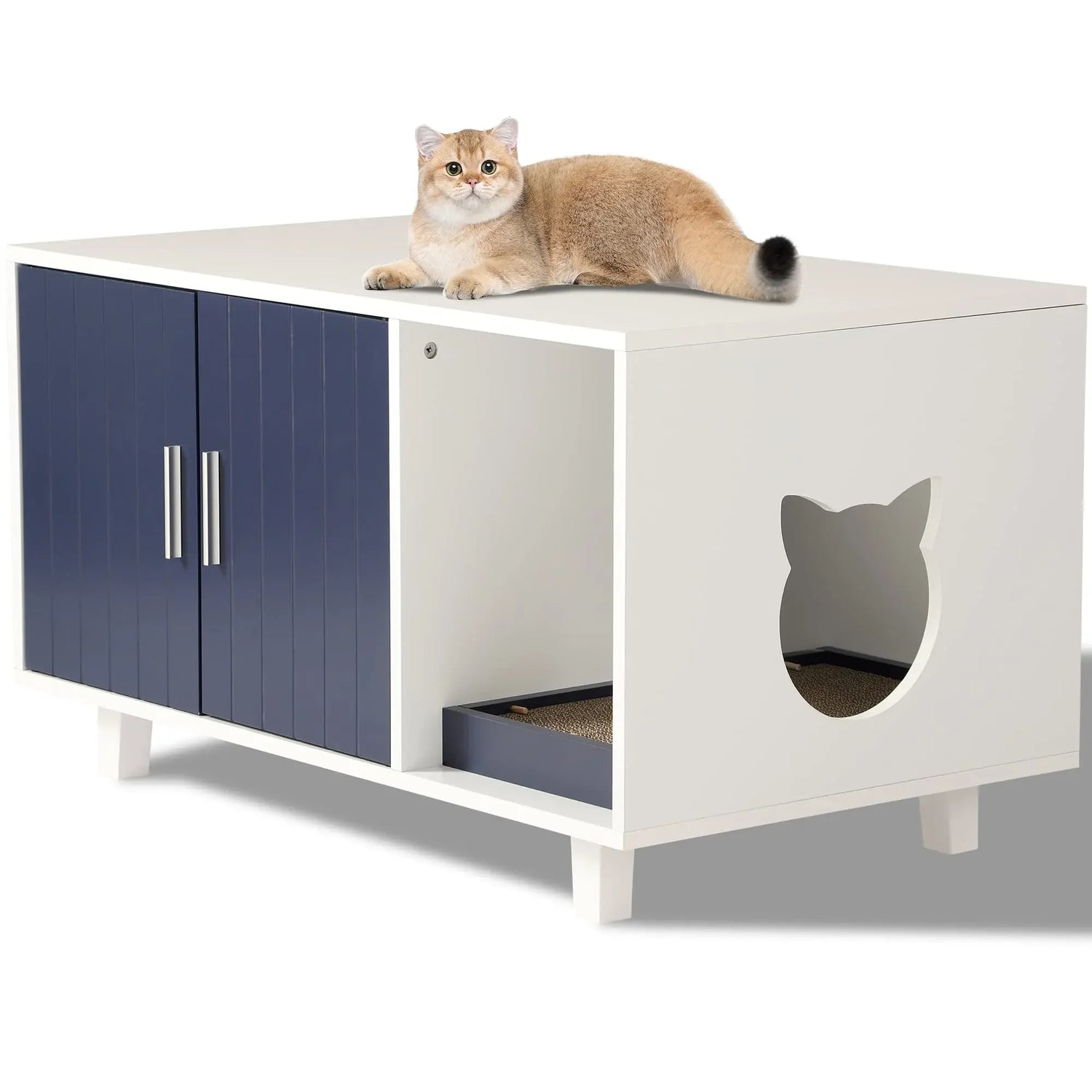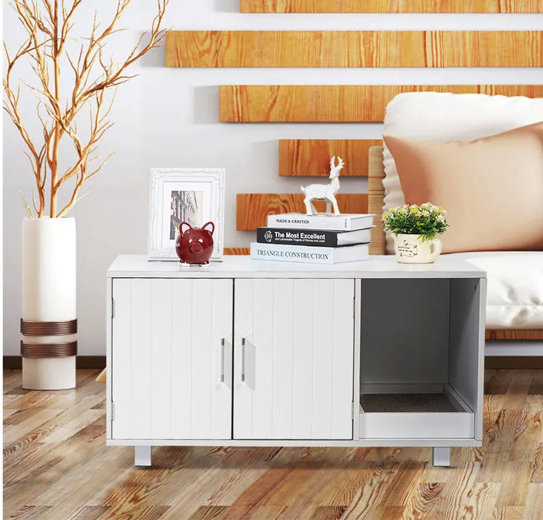 Ce meuble cache-litière moderne blanc offre un espace fermé pour la litière et du rangement, combinant élégance et praticité pour un intérieur toujours propre et stylé.