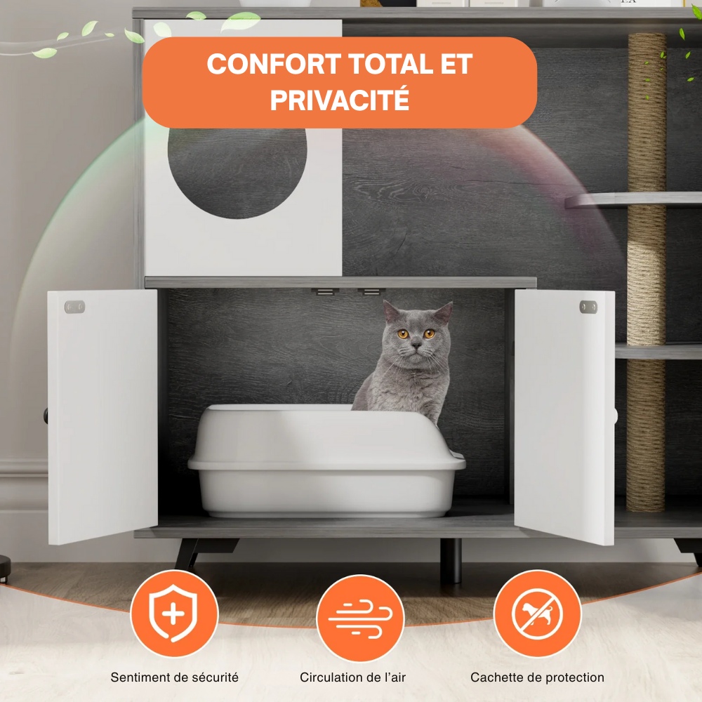 Offrez à votre chat un meuble cache-litière XXL avec étagères réglables et griffoir, design gris et blanc, combinant rangement, intimité et espace de jeu.