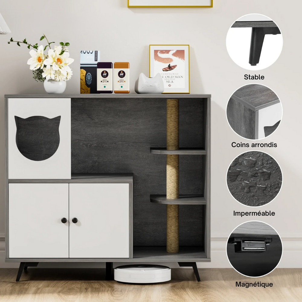 Meuble Cache-Litière XXL avec Étagères et Griffoir – Gris et Blanc