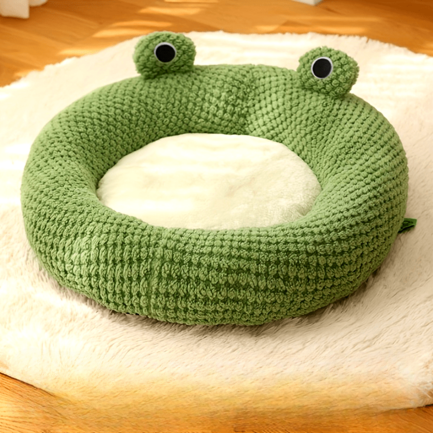 Ce lit rond pour chien combine confort et fantaisie avec son design grenouille adorable.
