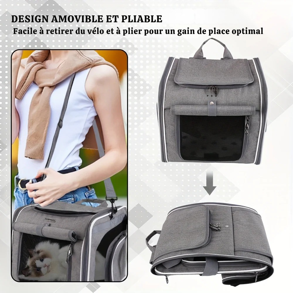 Ce panier vélo pour chien pliable est sécurisé, ventilé et multifonction. Il s’utilise aussi comme sac de transport, sac à dos ou siège auto.