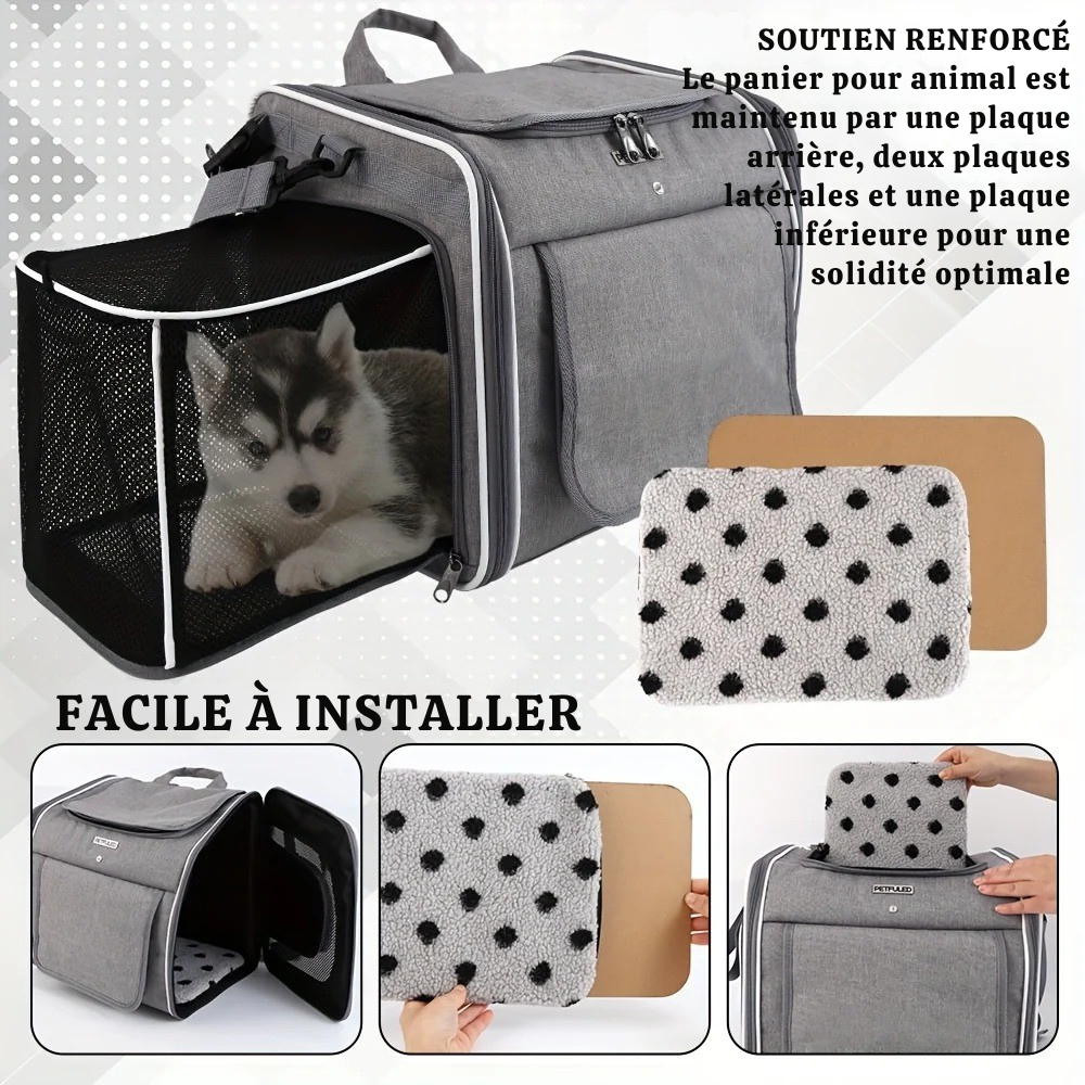 Ce panier se transforme en sac à dos, sac à main ou siège auto pour animaux.