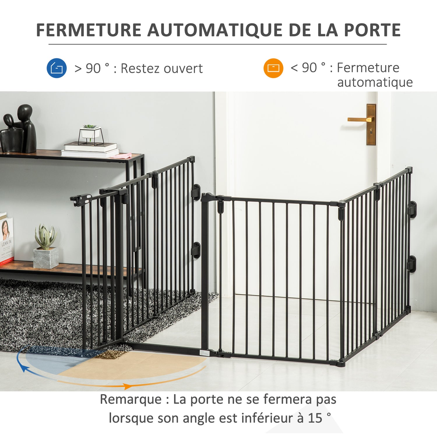 Offrez à votre chien un parc sécurisé et modulable en fer noir. Parfait comme barrière cheminée, enclos intérieur ou barrière escalier. Pliable et sans perçage.