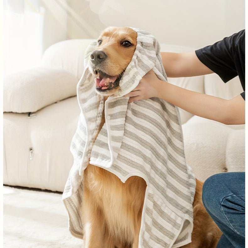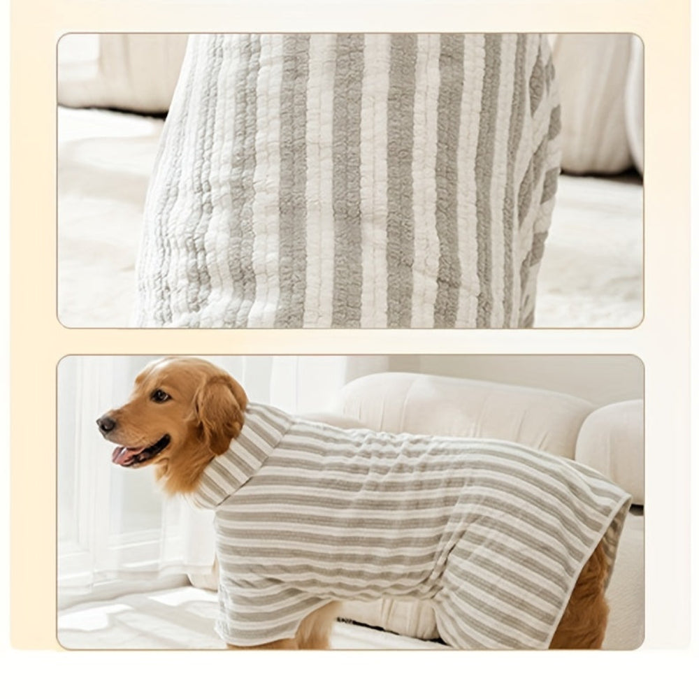 Peignoir de bain pour chien ultra-absorbant avec rayures élégantes. Sèche en quelques secondes après le bain, doux, confortable et facile à enfiler. Parfait pour chiens mouillés et frileux.