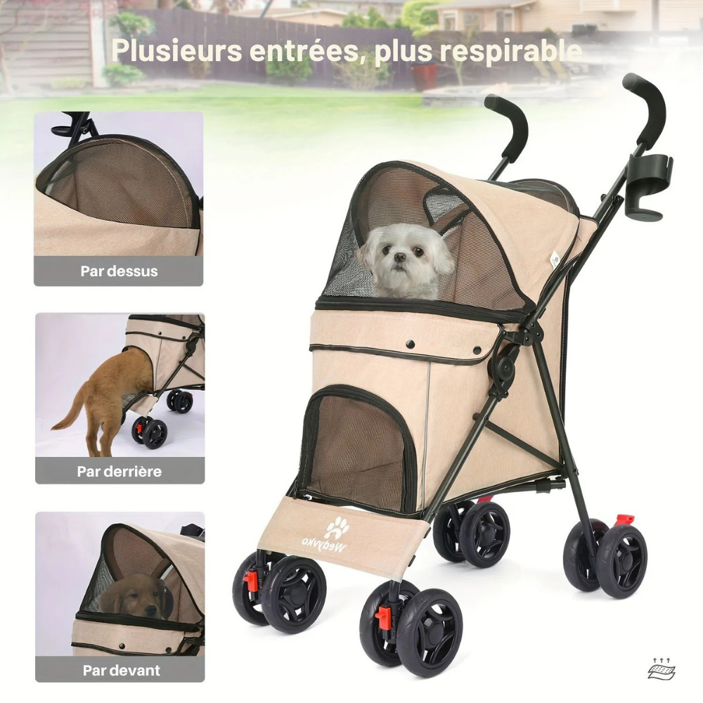Poussette animaux légère pliable, parfaite pour chats et petits chiens, avec grandes roues, filets respirants et pliage facile pour le transport.