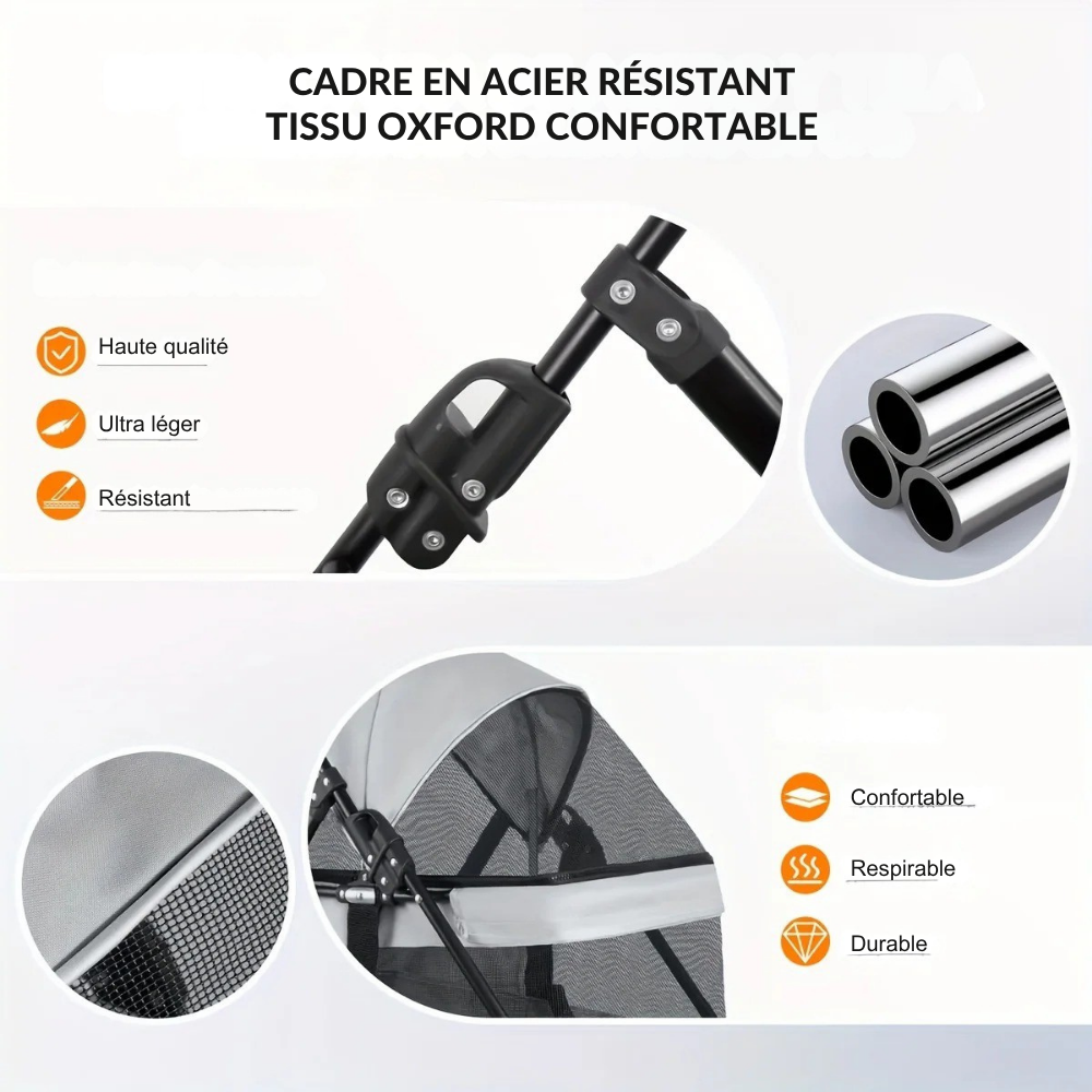 Poussette Pliable 4 Roues pour Chiens jusqu’à 17 kg. Légère, compacte, filet respirant, rangement facile. Parfaite pour les aventures urbaines et balades confortables.