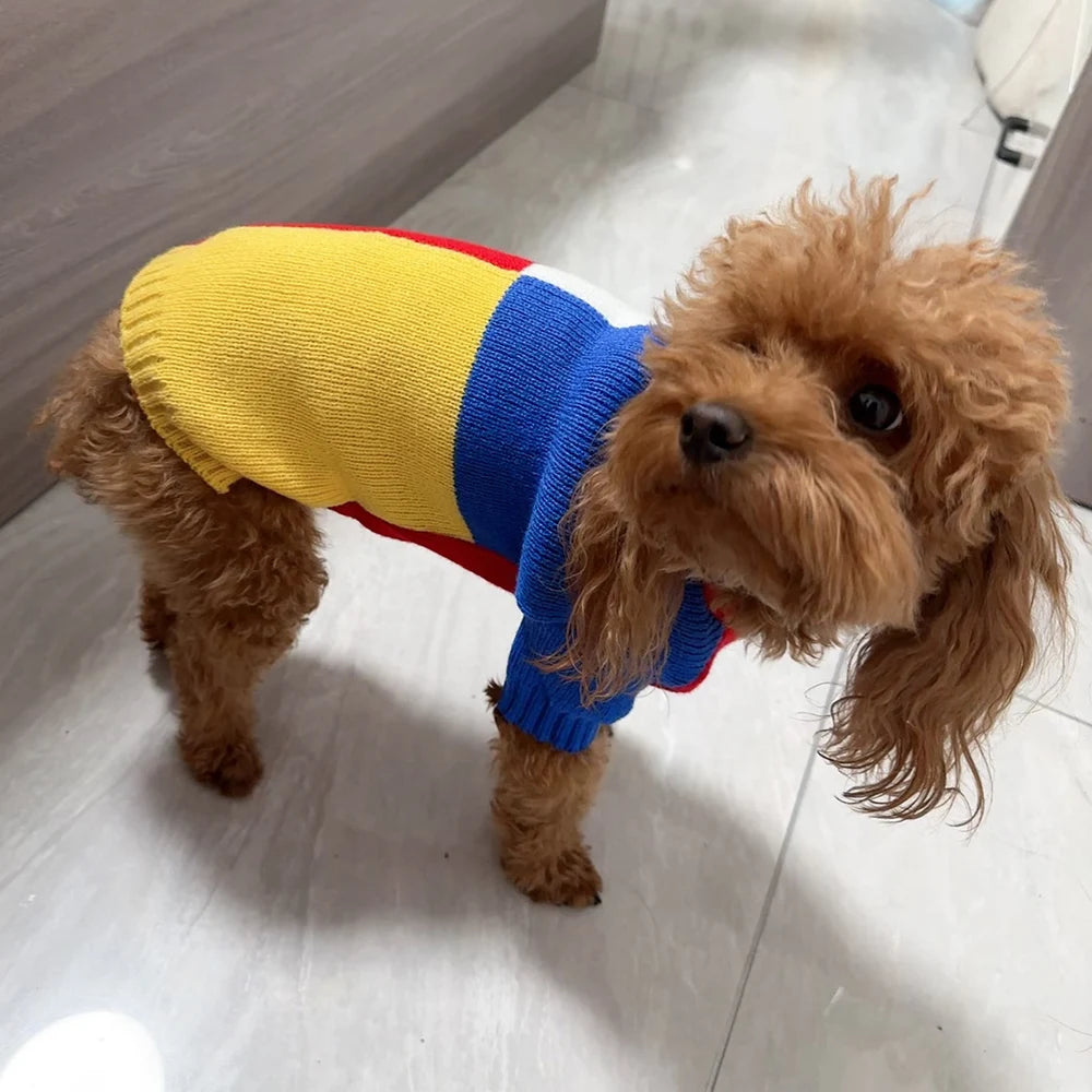 Ce pull pour chien attire les regards avec ses blocs de couleur.