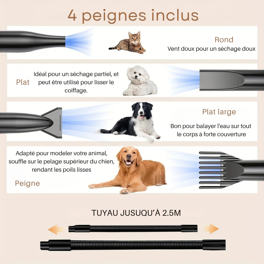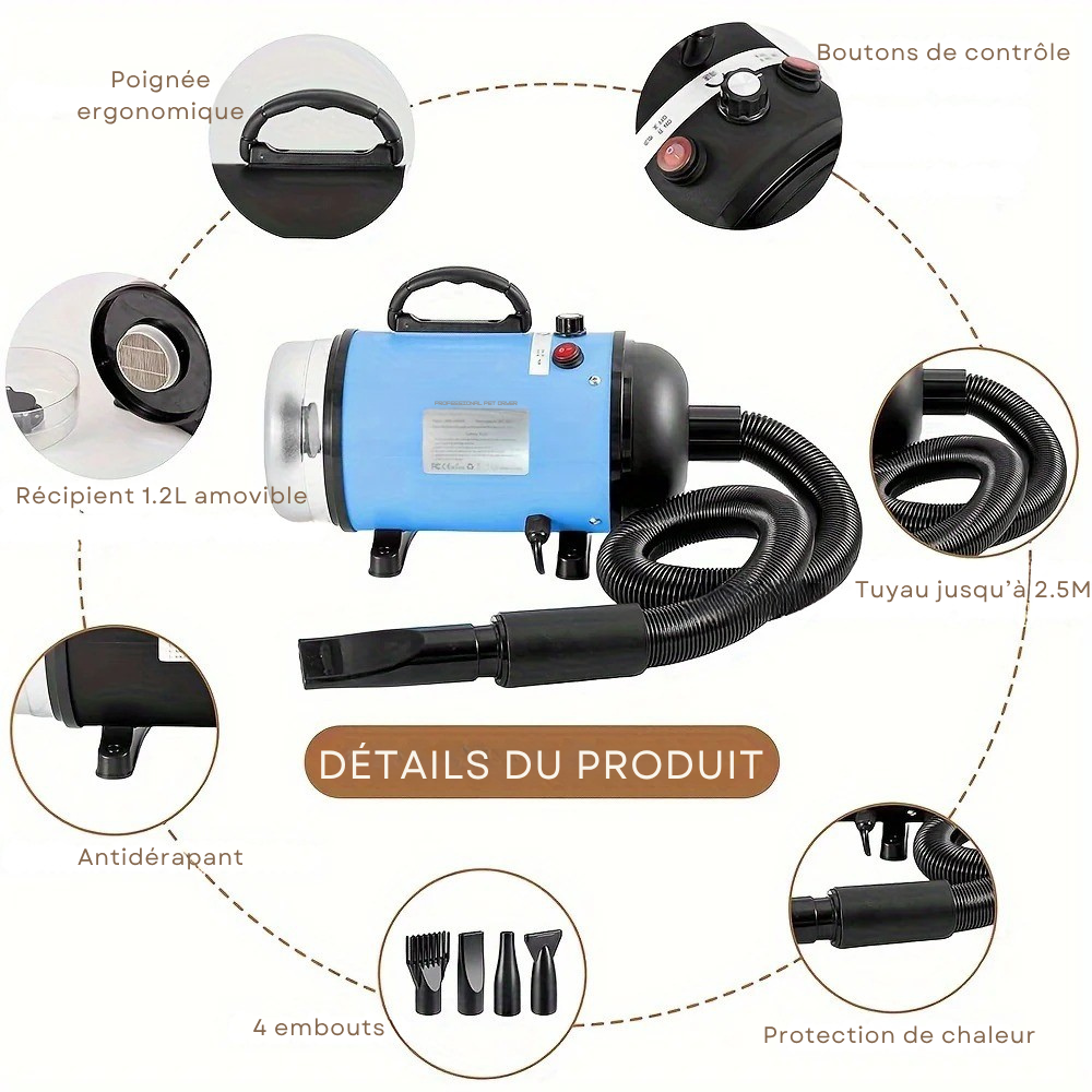 Un pulseur professionnel pour animaux en ABS robuste, silencieux et puissant, idéal pour un toilettage maison efficace grâce à ses 4 buses et son tuyau rétractable.