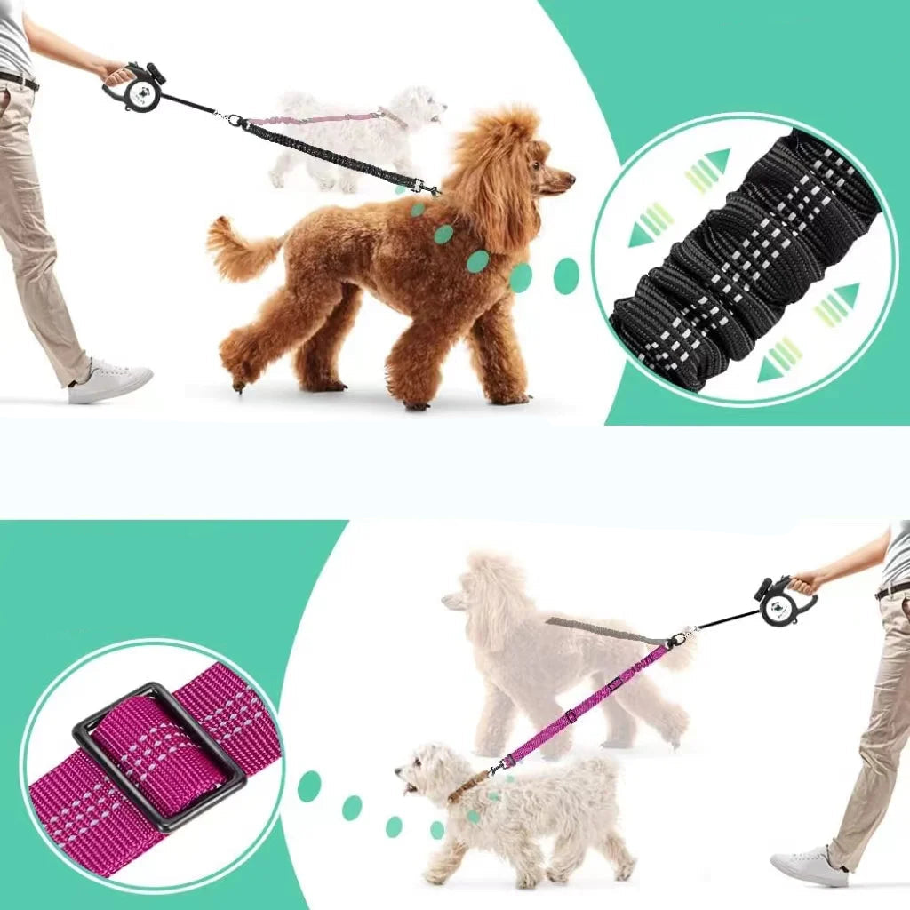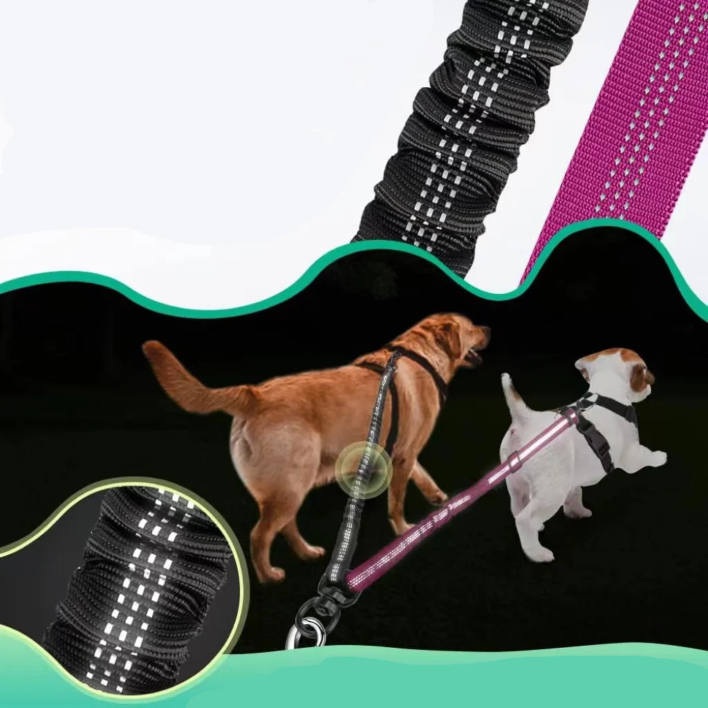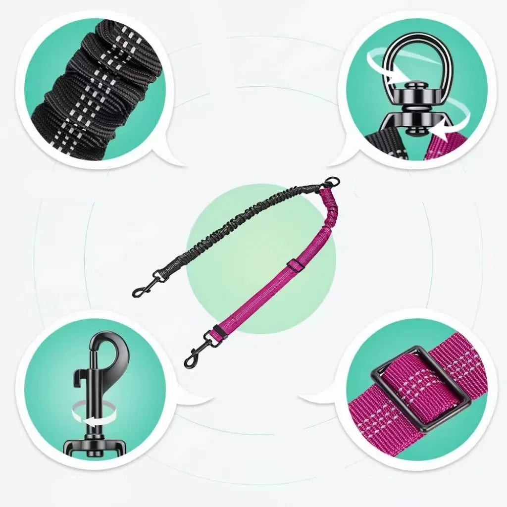 Ce répartiteur de laisse élastique pour chien en nylon réfléchissant offre un confort inégalé pour promener deux chiens sans tirer, même de gabarits différents.