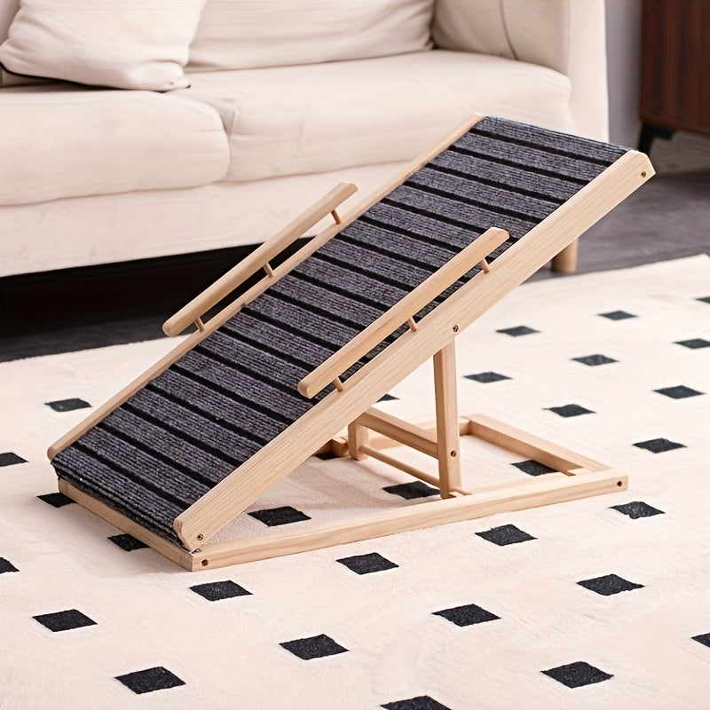 Rampe réglable en bois pour chiens, avec surface antidérapante et hauteur ajustable. Idéale pour canapé ou lit, pliable et élégante, adaptée aux chiens de taille moyenne.