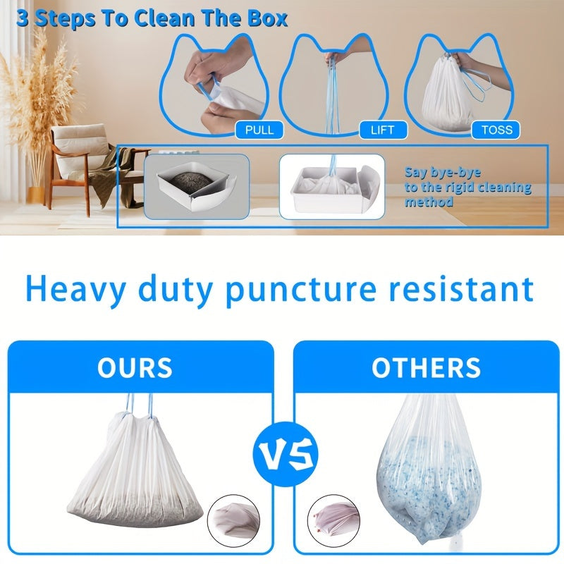 Gardez votre bac propre avec ces sacs de litière anti-fuites en polyéthylène, résistants et anti-odeurs, pour un entretien simple et hygiénique de la gamme CleanPaws.