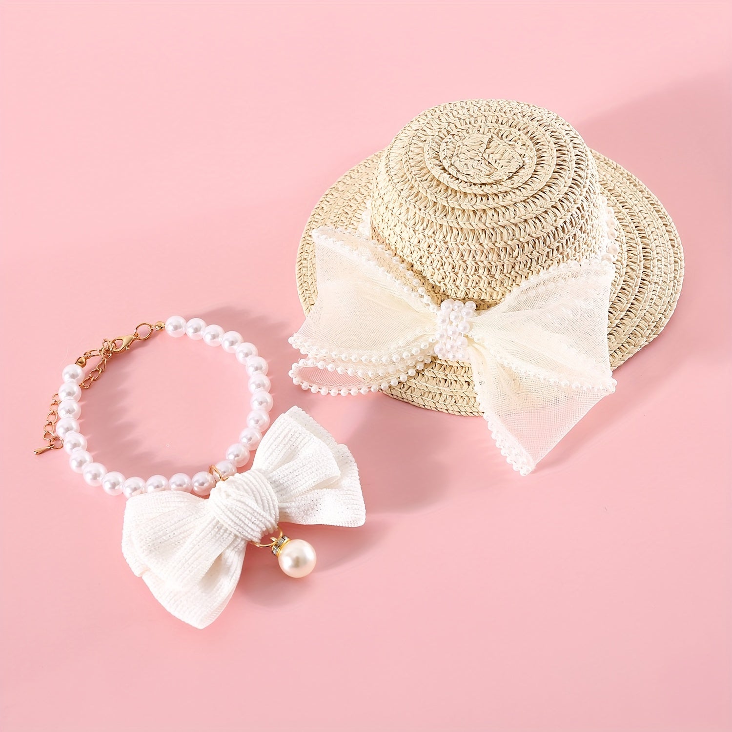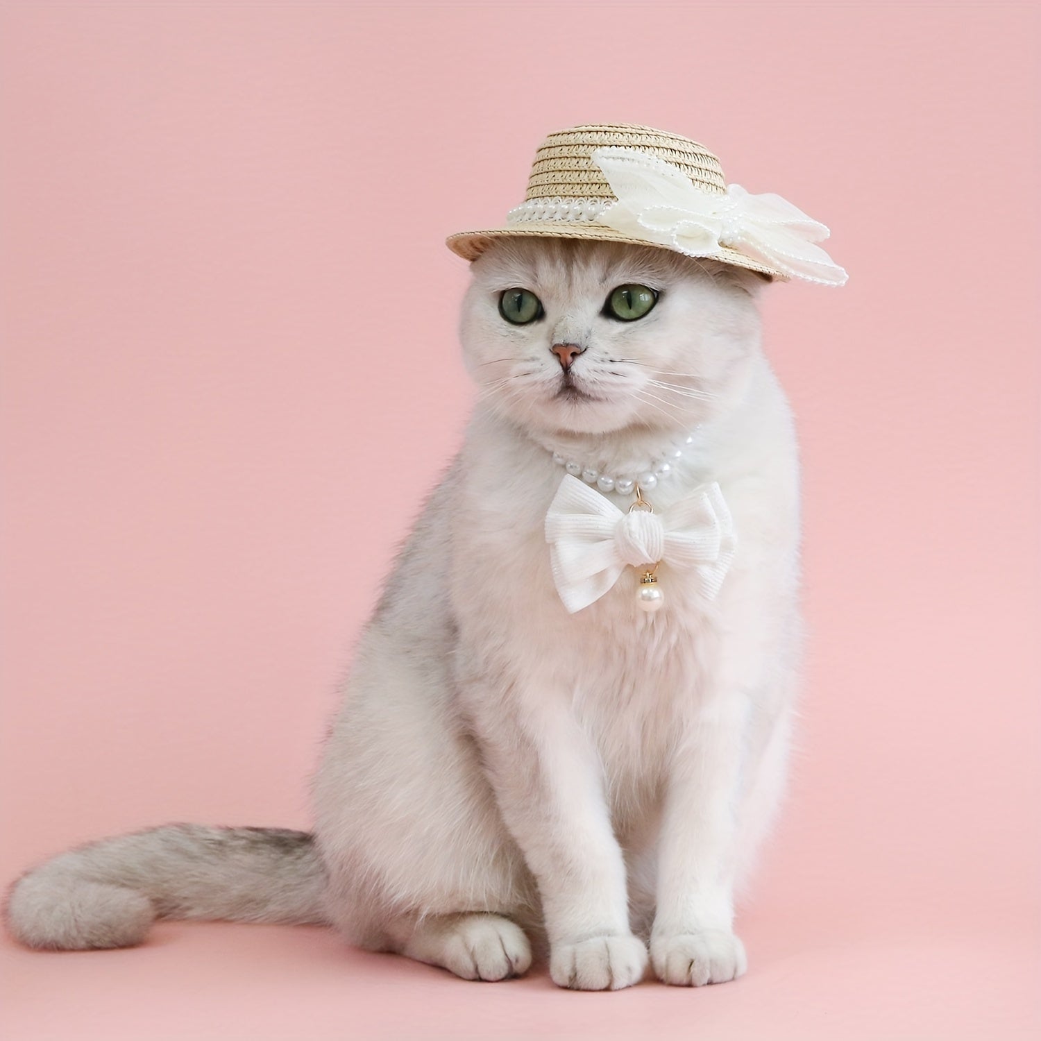 Ensemble raffiné composé d’un chapeau tressé et d’un collier perlé, idéal pour chiens et chats de petite taille en été.