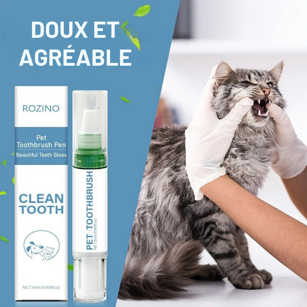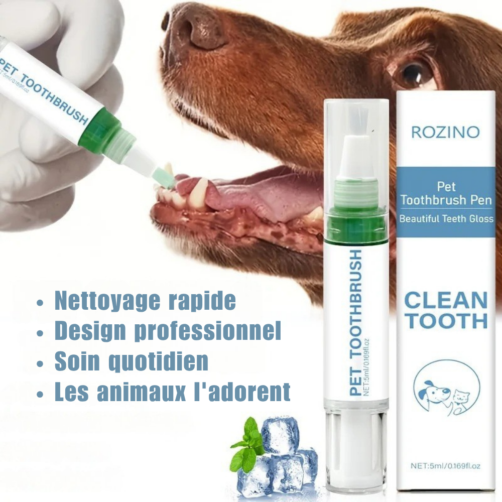 Éliminez la mauvaise haleine et le tartre de vos animaux avec le stylo brosse à dents ROZINO, à la menthe vanillée, pour chiens et chats.
