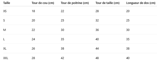 - Dimensions : 6 tailles disponibles (XS à XXL, adaptées aux chats sans poils)