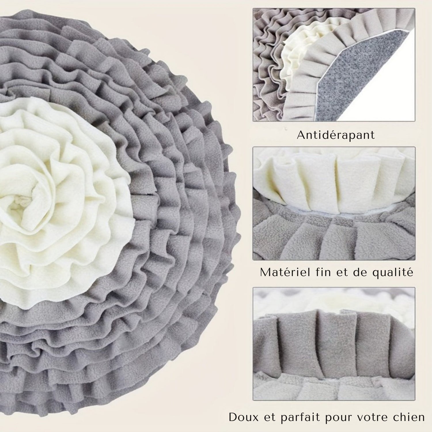 Tapis de fouille rond au design floral, fabriqué en polyester doux. Favorise une alimentation lente et stimule l’odorat. Convient aux chiens de toutes tailles.